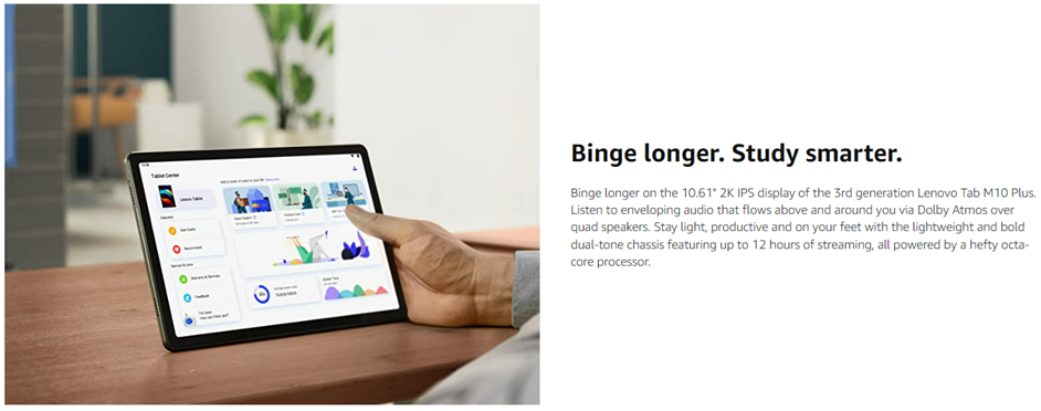 You can binge longer and study smarter with the Lenovo Tab M10 Plus 3rd Gen Android Tablet. Sleek, thin, and lightweight, this handy 10-inch tablet goes wherever you do, packing power and performance into a bold and contemporary aluminum chassis that's just 0.29" thin and as little as 1.03 lbs. Slip your Lenovo tablet into a shoulder bag, your school backpack, or carry it in folio case (available separately). The bright and colorful 10.6" display offers full HD clarity, so you can stream your favorite movies and shows for hours! Plus, with the special Reading Mode and TÜV Low Blue Light certification, you can enjoy long, comfortable hours of screen time on this Android tablet without straining your eyes. Music and audio sound great with the immersive quad speaker system optimized with Dolby Atmos®.This portable entertainment tablet is great for students, too, as you'll enjoy all-day performance with octa-core CPU and long battery life – including up to 12 hours of video playback time*. Take it with you wherever you go for reading, note-taking, streaming, and staying connected. With WiFi and Bluetooth® built in, you can watch your favorite movie, check your email, or have a video chat with friends or family from home or on the go.* All battery life claims are approximate and based on internal testing under optimal laboratory and network conditions. Actual battery performance will vary and depend on numerous factors including product configuration and usage, software, operating conditions, wireless functionality, power management settings, screen brightness and other factors. The maximum capacity of the battery will naturally decrease with time and usage.