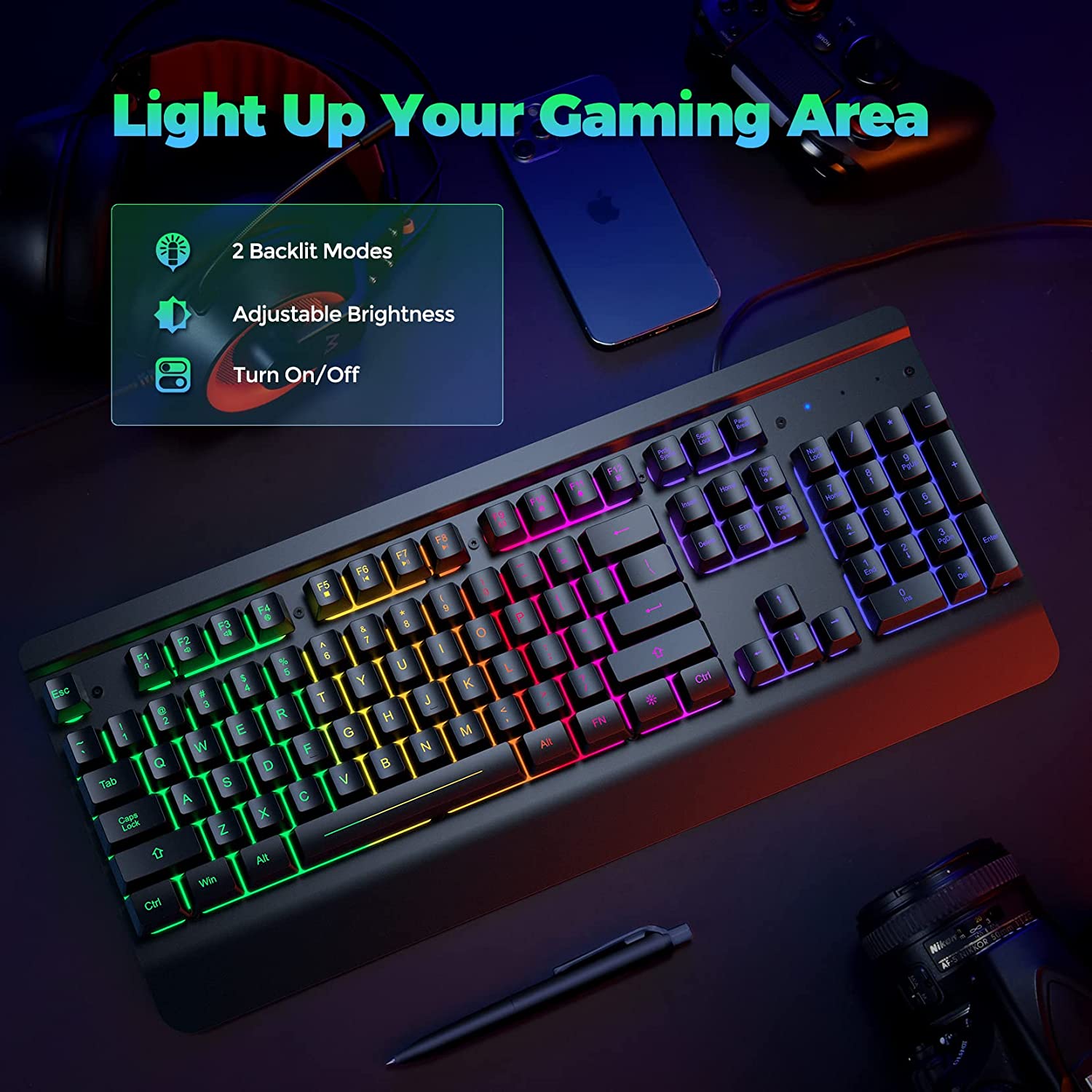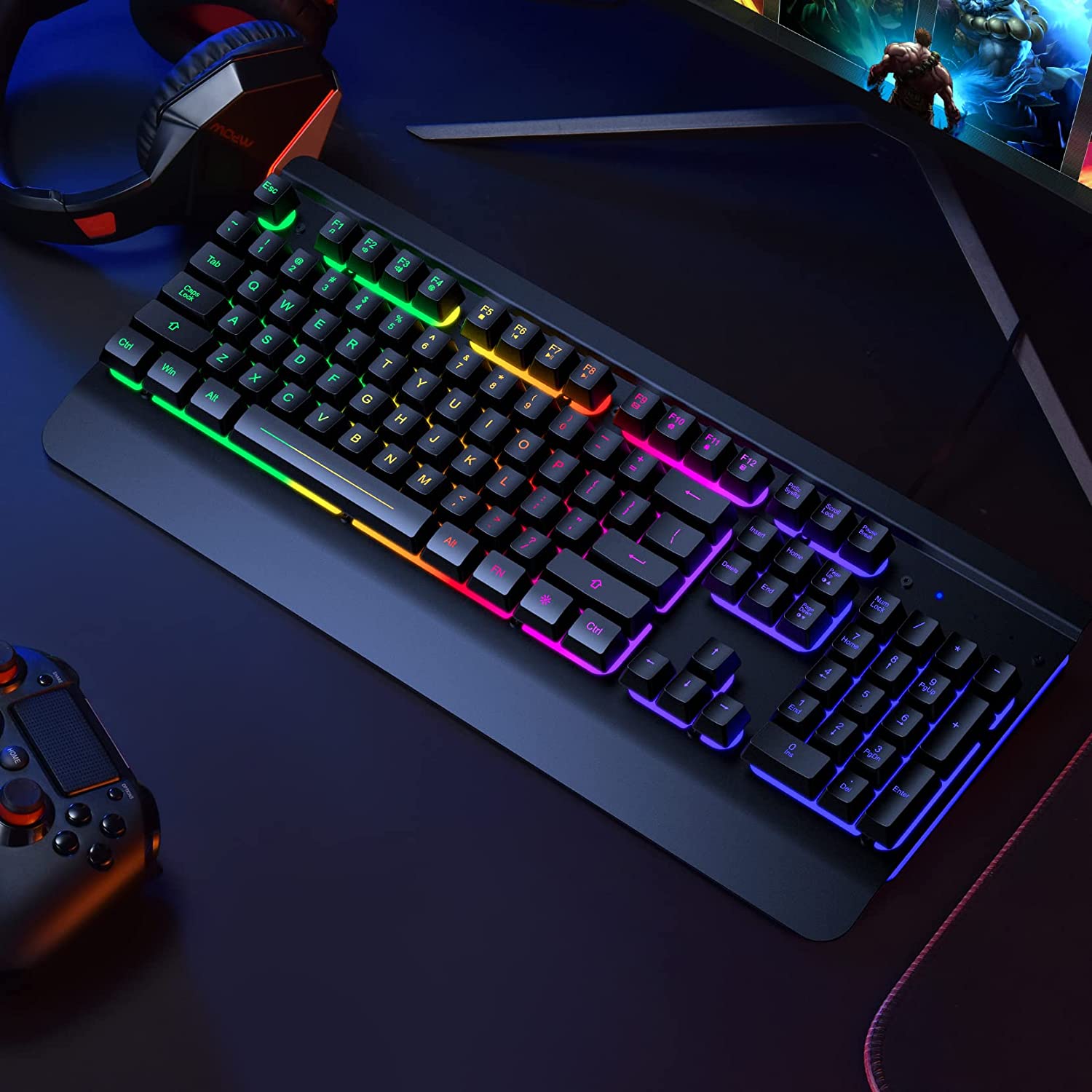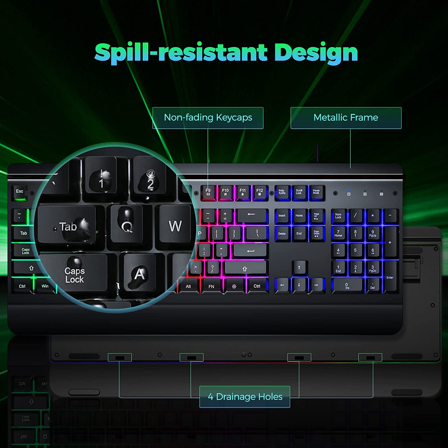 • ?【Durable Metal Panel Keyboard】This rainbow backlit keyboard is designed with an aluminum alloy panel, which not only improves the overall texture of the USB keyboard but also greatly improves the durability and water resistance. The metal frame on the keyboard is also coated with rubber oil, which is skin-friendly and feels more comfortable. At the same time, there are 4 drainage holes at the bottom of the led keyboard, you don't worry about spilled liquids that will damage the computer keyboard.