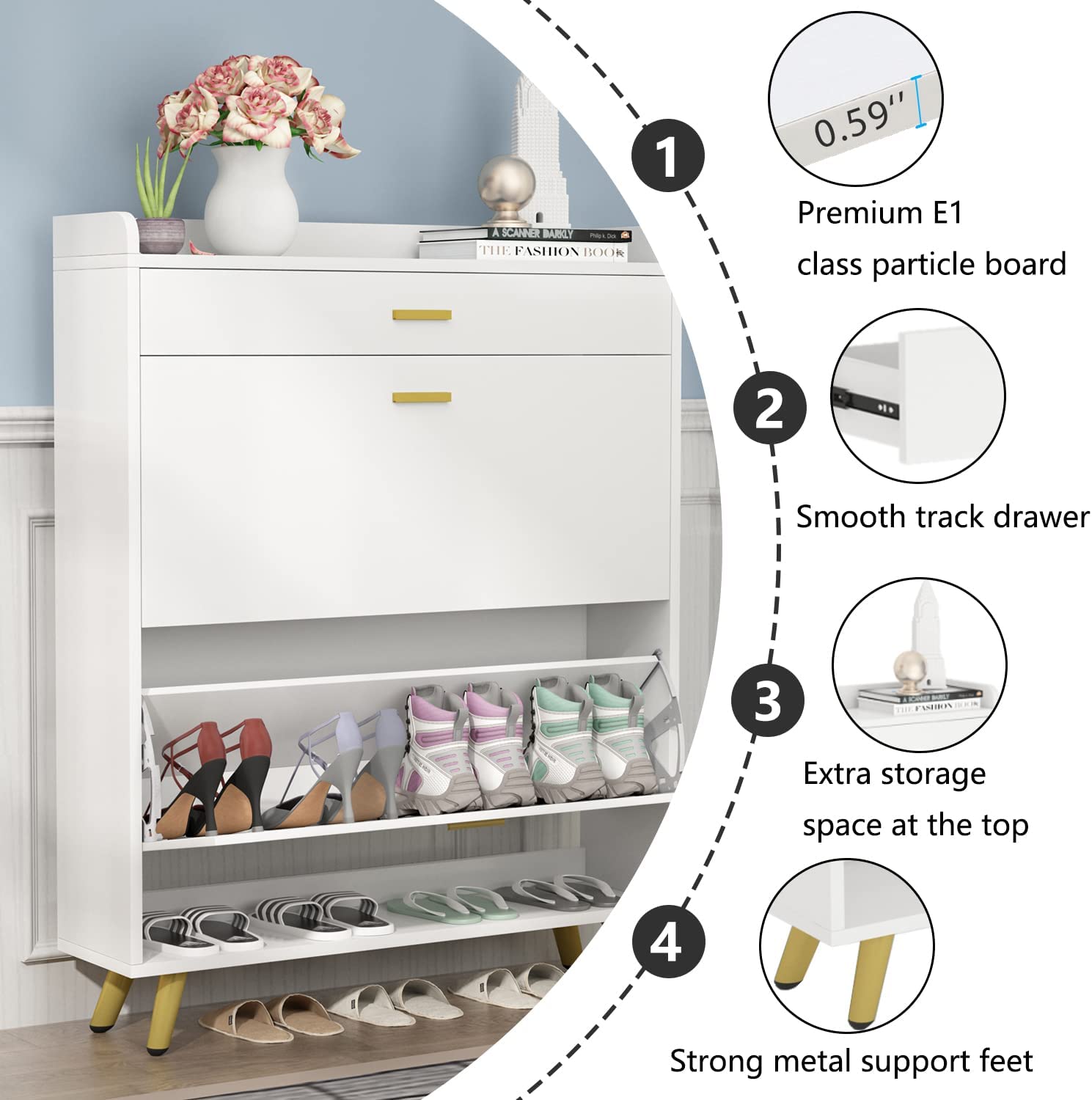 【Multi-space Storage】 - The design of the large top shelf/drawer/hidden 4-layer shoe shelf/open bottom shoe storage greatly provides space for storing shoes, toys or handbags.The protruding part of the top frame prevents keys, balls and other objects from falling.