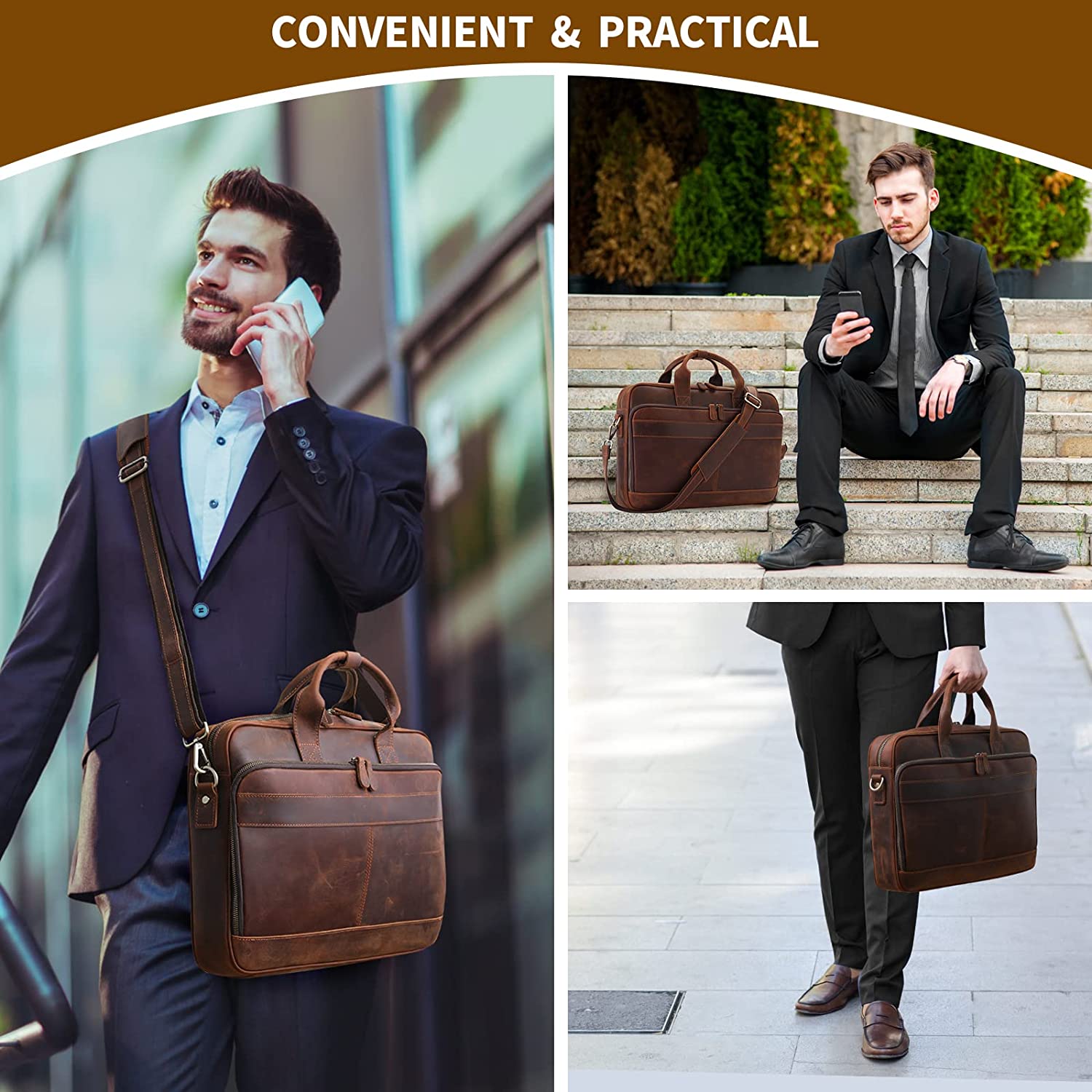 Material: 100%Cowhide Grain leather mens briefcase. Sturdy top handle men's briefcase, adjustable nice shoulder straps (appr. 85 ~ 140 cm).