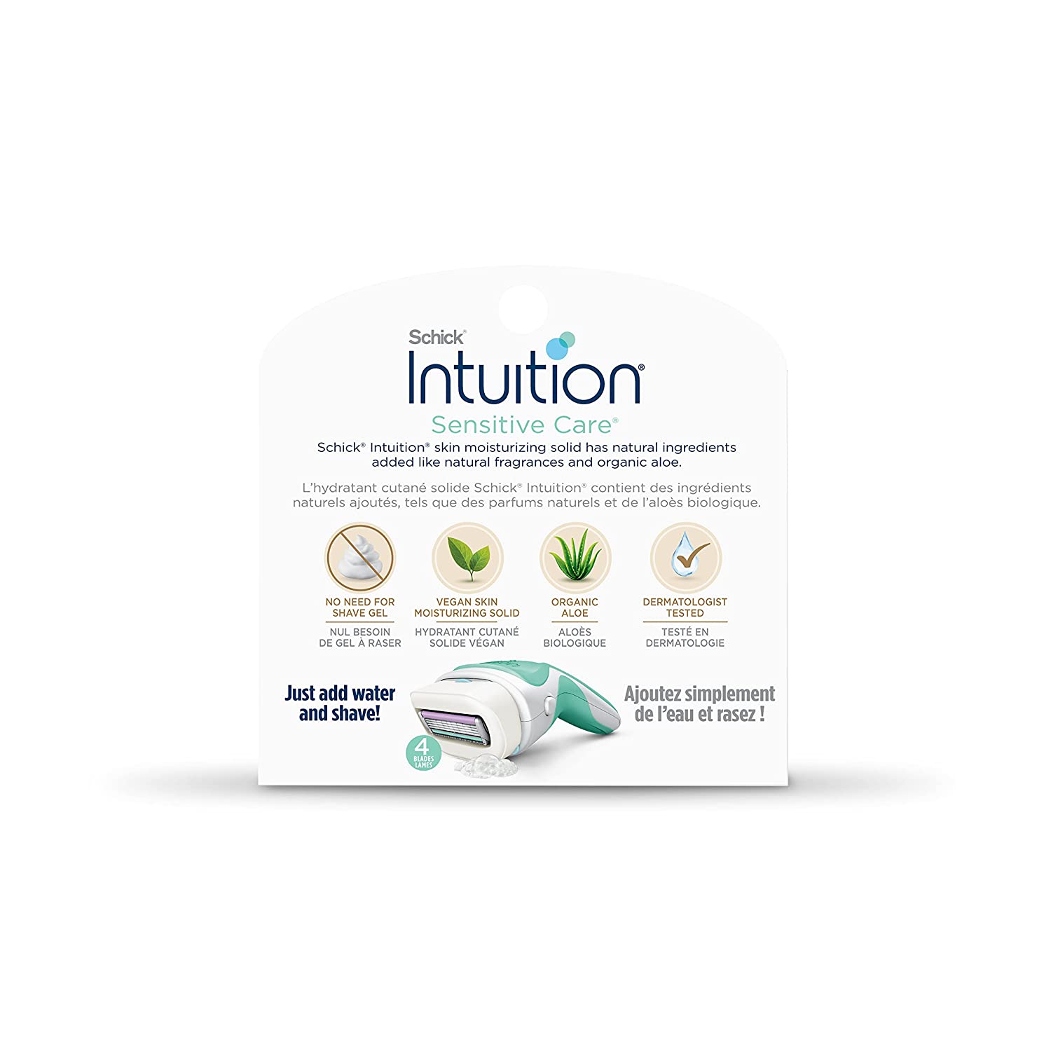 The 6-count Schick Intuition Sensitive Care Razor refill pack includes 6 razor blade cartridges that can fit any Intuition handle. Schick Intuition Sensitive Care women’s razor refills lather and shave in one easy step, with no need for shave gel! Our sensitive skin razor refills are made with natural fragrances and organic aloe. The gentle Sensitive Care formula is dermatologist tested, vegan and hypoallergenic, making it great for sensitive skin. Each smooth-gliding 4-blade cartridge has a pivoting head to hug the contours of your legs and body. Plus, Schick Intuition Razor refills are perfect for first-time shavers, minimizing nicks and cuts.