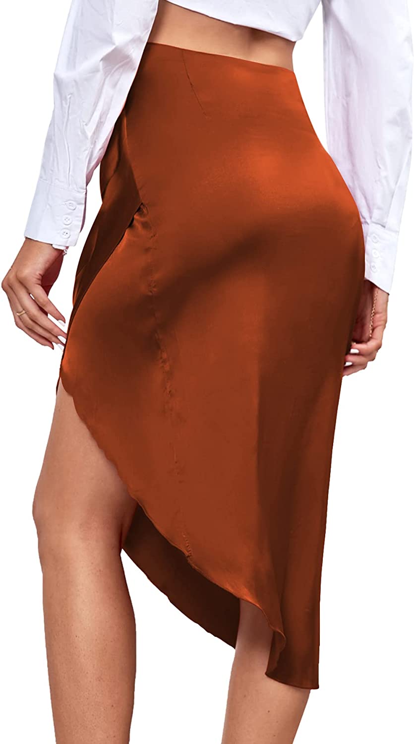 Solid color, high split side, ruched, satin skily frabric, high waist cocktail midi skirt for women and girls.