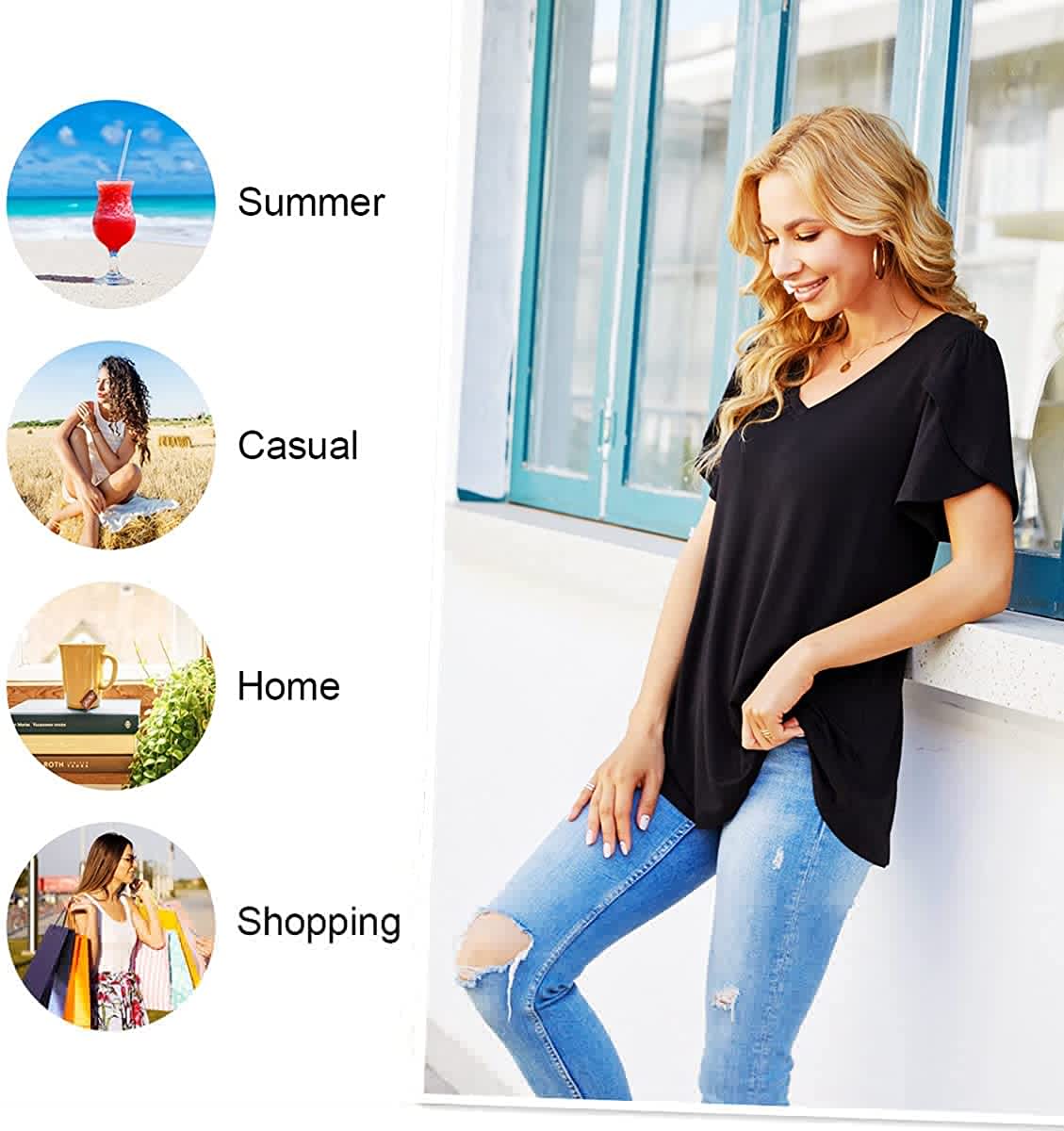 ❤ 【 Features 】 casual tunic top, v neck tops tee, petal short sleeve tshirts, stretch loose blouse, solid color and print, on the hip length, sexy, plain, trendy and elegant.