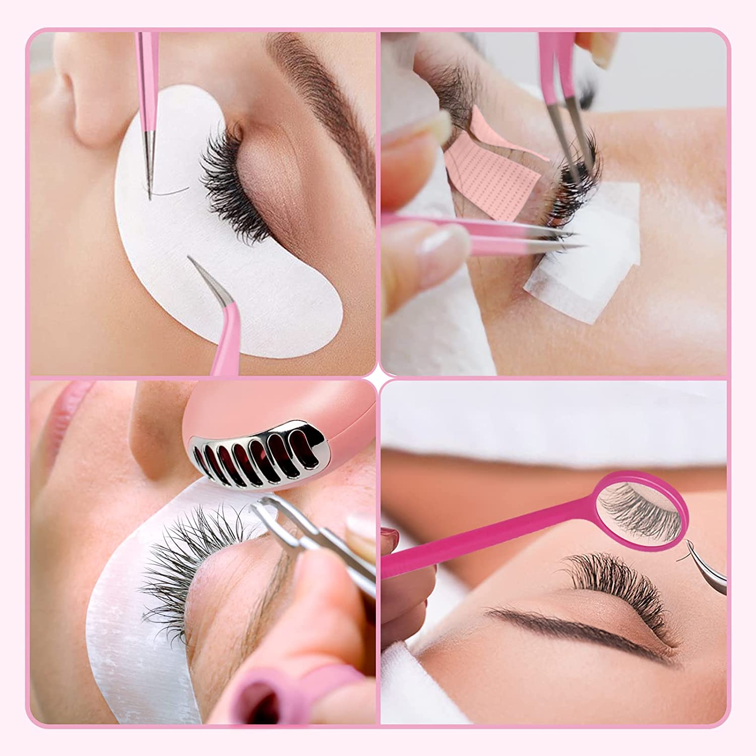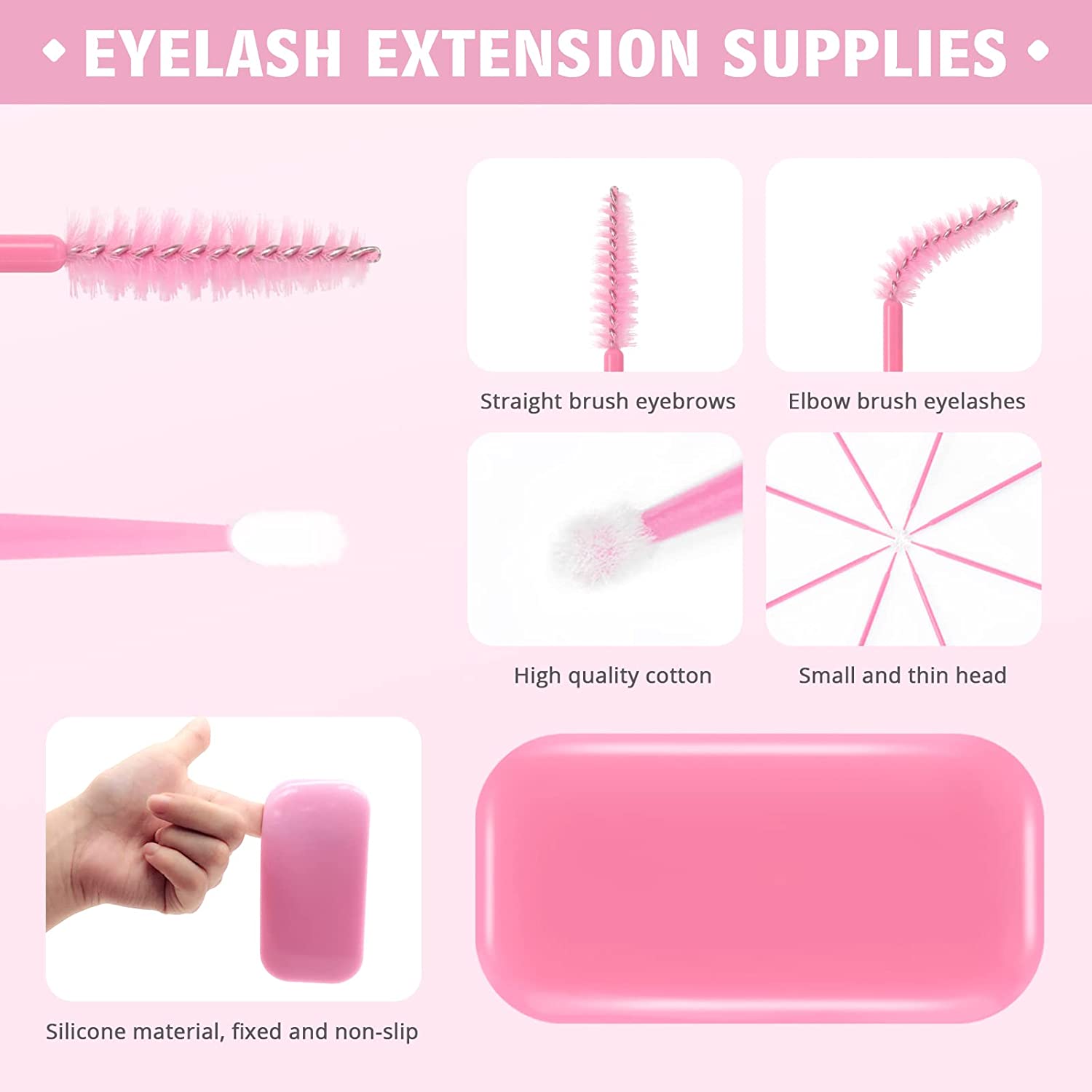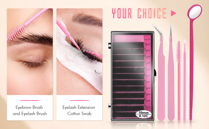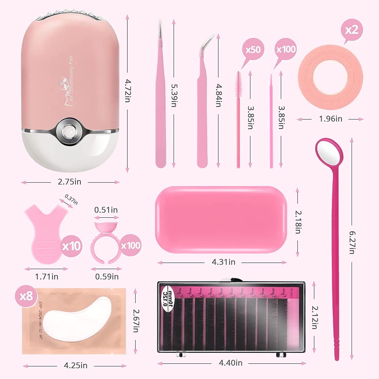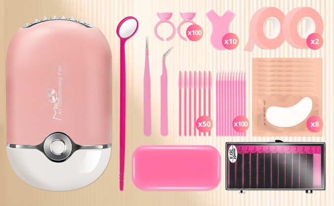 ? Pink Eyelash Extension Supplies -- Buqikma lash extension kit include portable air conditioner cooling fan,100PCS glue ring,1PC lash mirror,2PCS lash tape,50PCS Mascara Brushes,100PCS cotton wands,8PCS eye gel pads,10PCS Y-brush,2PCS tweezers,10mm false indivisual eyelash and a silicone pad.