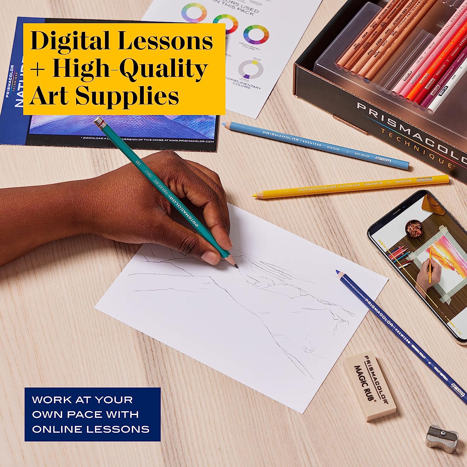 Learn art at your own pace from the comfort of home with Prismacolor Technique. Each Prismacolor Technique set features a unique coupon code for access to digital art lessons you can’t get anywhere else. Instructed by Prismacolor artists, each lesson will teach you how to use the professional-grade art supplies included in the set to create a piece of art you will cherish. The Level 2 Nature Drawing Set is designed for those who want to keep building on their art knowledge. You’ll practice color usage and style while creating a stunning sunset landscape. The set features Prismacolor colored pencils with rich cores for smooth color laydown, and watercolor pencils and brush markers that create brilliant watercolor effects. You’ll also receive brushes, an eraser, a drawing pad, a mini sharpener, a drawing template, a set of instructions, and hours of online content to learn at your convenience!
