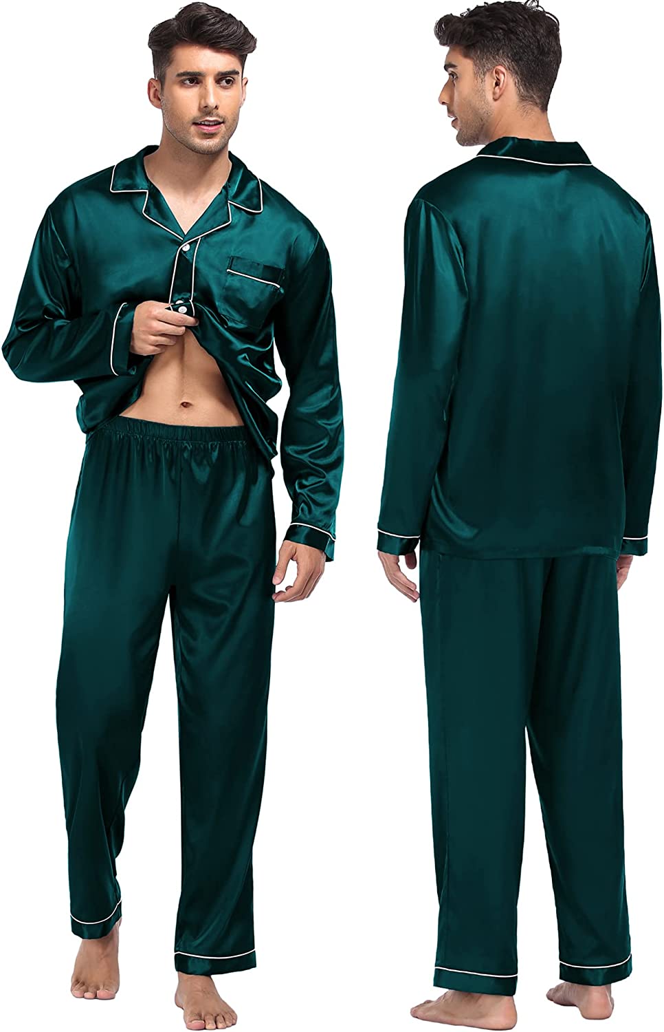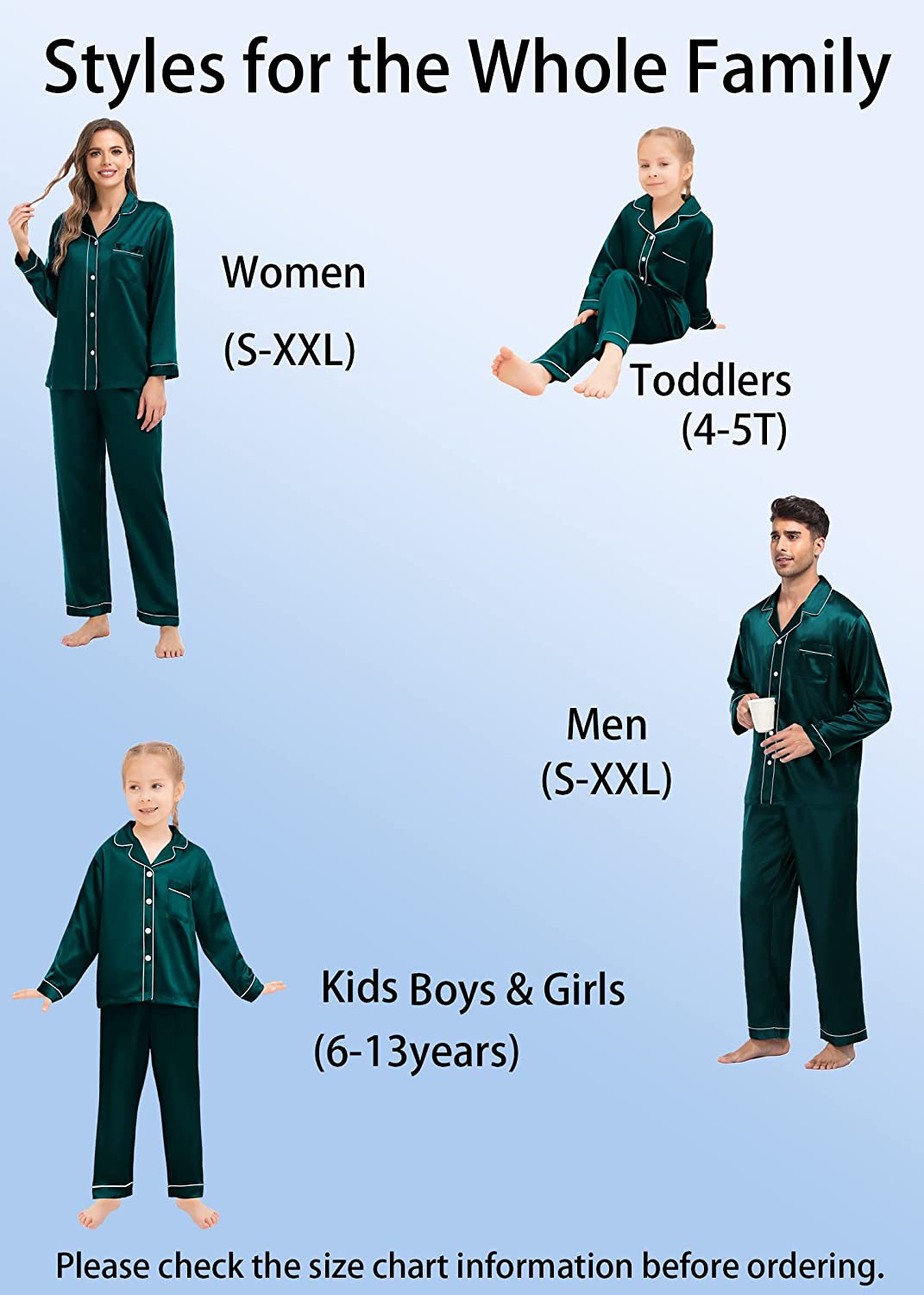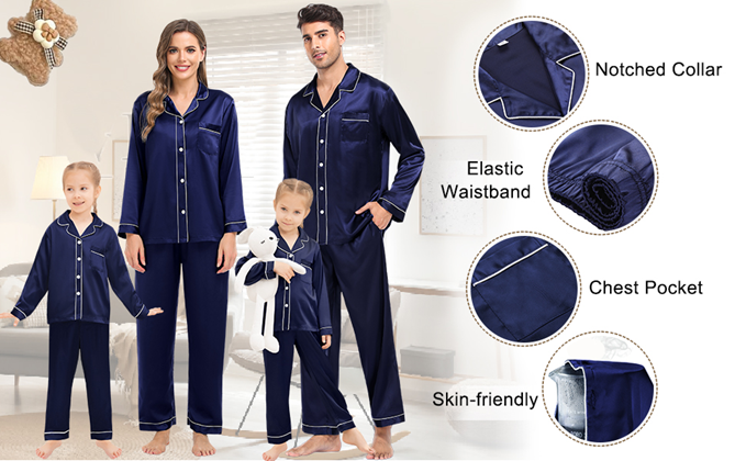 • 【The Whole Family】- The family satin pjs set are available in sizes for women, men, girls, boys and kids. Make this super-soft sleepwear part of your family’s party traditions. The whole family silk sleepwear features a notch collar, long sleeves, button-up shirt with front chest pockets, and pajama pants with an elastic waistband, which is sure to give you and your loved ones that warm and funny feeling.