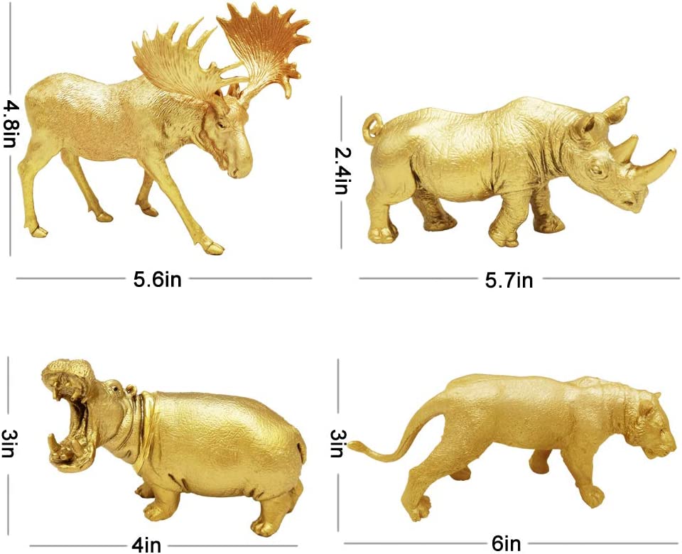 WHAT'S INCLUDED: 12 piece golden animal figurines set includes 3 giraffes, 3 elephants, 2 elk, 1 lions, 1 tiger, 1 rhino, 1 hippo.