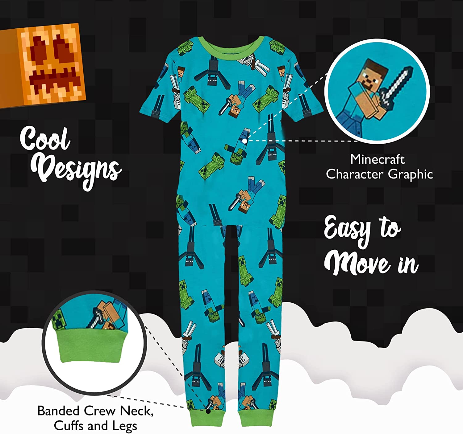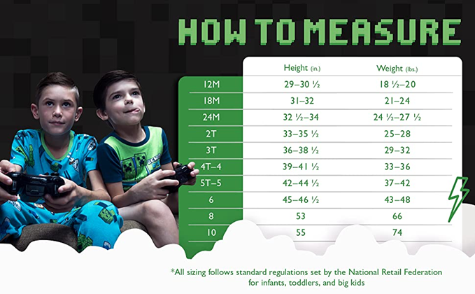 - ENJOYABLE BEDTIME: These fun “Minecraft” pajamas for boys come in a variety of styles and feature charming graphics and bright colors. These boys’ short-sleeve pajamas are available in sizes 4–12.