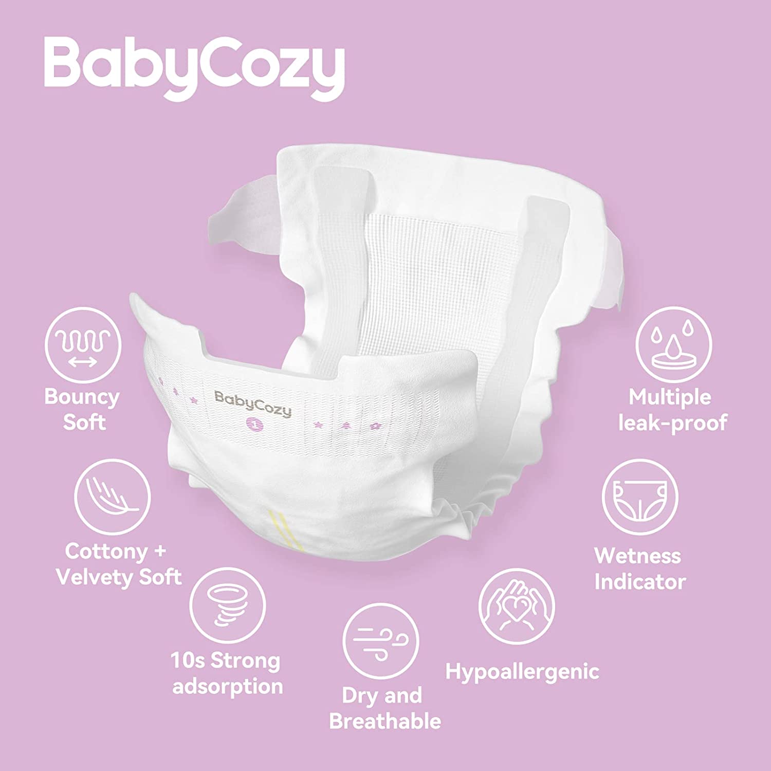 ?【3X Dry and Breathable】10 secs fast absorption, nearly 0 liquid going back up, 1 millions+ venting micro holes -- strong absorption diapers are truly unfriendly to moist, red bum or rash. Cozy diapers are designed to help you achieve a comfy nap or an overnight sleep for your baby and you