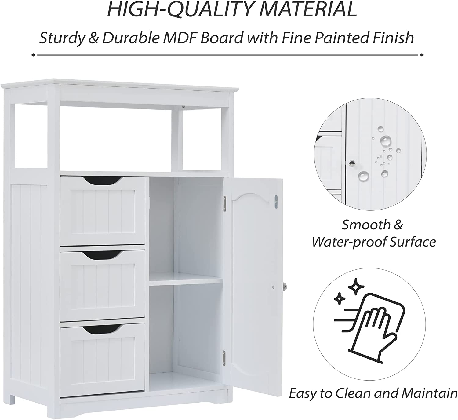 • Flexible Storage Space: This bathroom cabinet has a large and enough storage space: one top open shelf, three wide drawers, and one cabinet with door. You can put tissue, towels, shampoo, body lotion, soaps etc. into it. The upper open shelf allows easy taking stuff while the enclosed door and drawers keep dust away from your essentials.