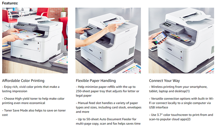 The reliable, robust Brother MFC L3710CW compact digital color all in one printer is a great choice for the busy home or small office looking for laser printer performance. Affordably add color to your printing for vivid images on all your documents. Quick print speeds of up to 19ppm, scan speeds up to 29ipm black and 22ipm color plus robust construction ensures your all in one works as hard as you do. The compact design is ideal for smaller spaces.The MFC L3710CW helps make color printing affordable for your home or small office looking for laser printer quality. Toner Save Mode helps you save on toner costs. With Brother affordable increased yield toner options, there’s never been a better time to add a Brother digital color printer to your home or small office. Choose from Standard or High Yield toner to help make color printing even more economical.Flexible paper handling options accommodate a variety of paper types, sizes and styles. The up to 250 sheet capacity adjustable paper tray lets you print longer with less refills and handles letter or legal size paper while the up to 50 sheet automatic document feeder helps you save time with easy multi page copy, scan and fax. The manual feed slot accommodates printing on card stock, envelopes, photo paper and more.The Brother MFC L3710CW offers versatile connection options with built in wireless and Wi Fi Direct or connect locally to a single computer via USB interface. Print wirelessly from your desktop, laptop, smartphone or tablet.(1) Print from and scan to popular cloud apps(2) directly from the 3.7"" color touchscreen including Dropbox, Google Drive, Evernote, OneNote and more. Help save time by creating custom shortcuts on the touchscreen for your most used features. The Brother MFC L3710CW compact digital color all in one printer has a one year limited warranty .(1)Requires connection to a wireless network. (2)Requires an Internet connection and an account with desired service. (3)Approximate cartridge yield in accordance with ISO/IEC 19798 (letter/A4). (4)Reprinted from pcmag with permission. 2017 Ziff Davis. All Rights Reserved. (5)The mobile device must have NFC capability and run Android OS 4.4 or later. (6)Requires additional purchase. (7)Approximate 18,000 page yield each drum unit (may vary by type of use). (8)The recommended range of monthly printed pages to achieve the best possible performance and printer life. Printers are intended to handle occasional usage beyond this range with little or no effect. Consistently printing above the recommended print volume, however, may adversely affect the print quality or life of the machine. It is always best to choose a printer with an appropriate recommended print volume to allow for any anticipated increase in printing needs.