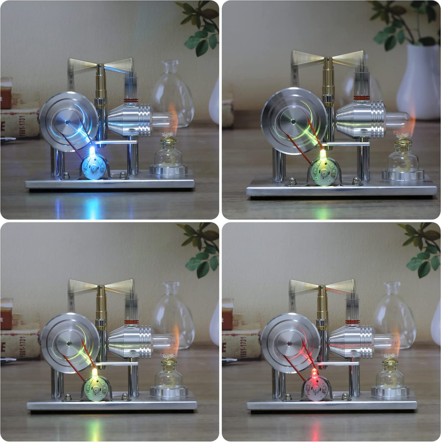 This is an interesting model toys, this stirling engine mode uses the heat by alcohol lamp to generate electric. The electric will light the led light to emit different colors. It is a great opportunity for you to investigate how stirling engine works. It can inspire your curiosity and creativity.