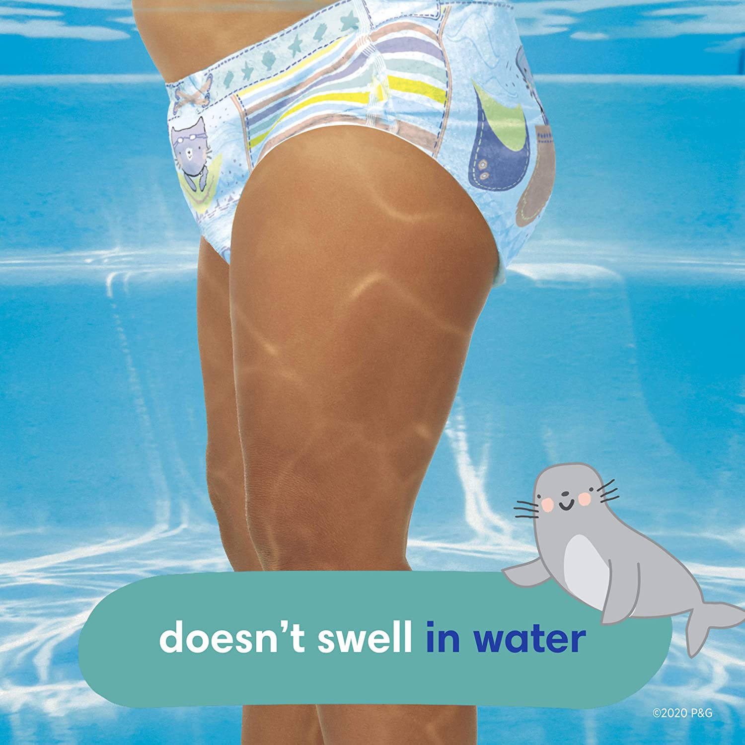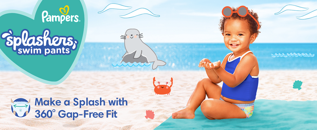 Your baby is free to make a splash in Pampers Splashers disposable swim diapers! Pampers Splashers don’t swell in water like regular diapers, giving your baby a comfortable fit when wet or dry. For secure protection in the water, Splashers Dual-LeakGuard BarriersTM fit snug around your baby’s legs to help contain messes, making them perfect for the pool, beach, splash park, and more. Only Pampers Splashers are designed with a 360° all-around stretchy waistband that fits like swimwear and easily pulls on and off—even when wet. Plus, Splashers are equipped with Easy-Tear Sides for a quick disposal with less mess, and our adorable, swim-inspired, all-over graphics look like real swimwear. Pampers Splashers make a day at the pool even more fun.