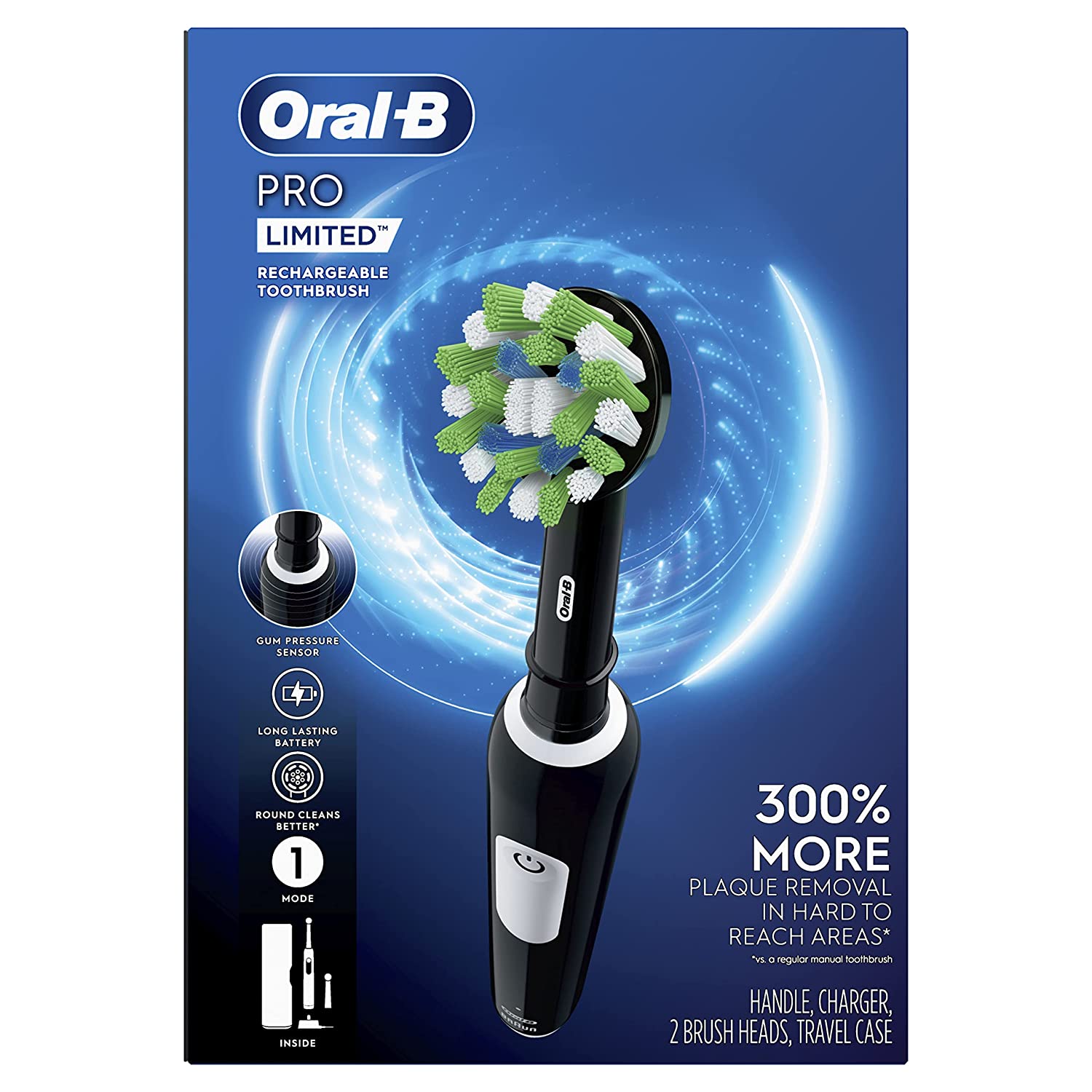 The Oral-B Pro Limited rechargeable toothbrush provides a clinically proven superior clean vs. a regular manual toothbrush. The professionally inspired design of the CrossAction brush head surrounds each tooth with bristles angled at 16 degrees, and 3D cleaning action oscillates, rotates, and pulsates to break up and remove up to 300% more plaque along the gumline than a regular manual toothbrush. The pressure sensor stops pulsations if you brush too hard to prevent harmful over-brushing and there is 1 mode, plus an in-handle timer to help you brush for a dentist-recommended 2 minutes. Trust in the precision engineering of Braun and the dental expertise of Oral-B, the #1 brand used and recommended by dentists worldwide. 100% Satisfaction Guaranteed. Manufacturer Contact Information Customer support : (800) 566-7252 or (800) 566-ORALB