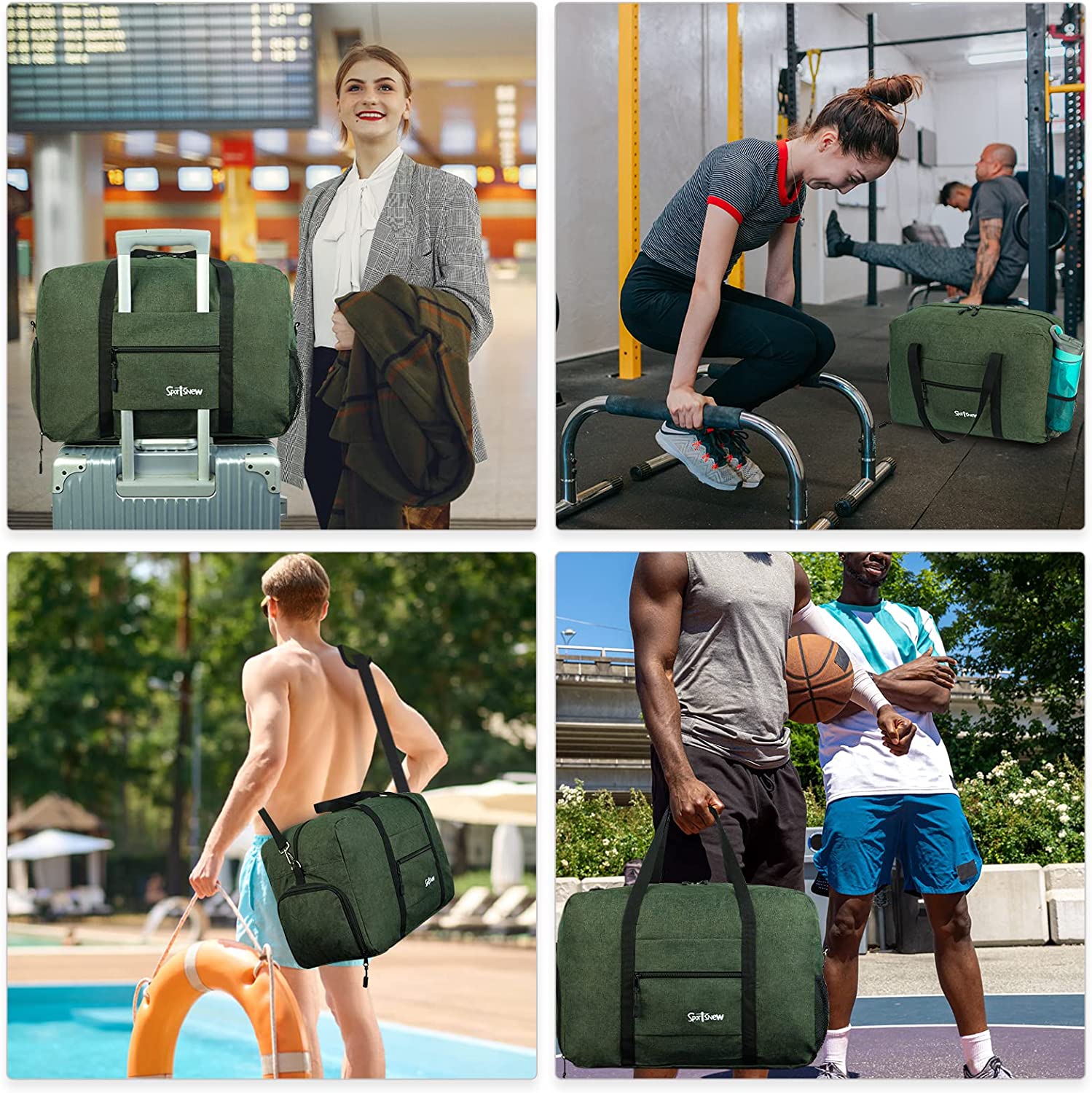 3 Carrying Options: over your shoulder, behind your back or by the bag's dual handles. You can use it as a sports gym bag, a carry on bag, a travel bag and a daily bag, perfect for workout, rides, gym, yoga, beach, pool, camping, practice days or weekend trips