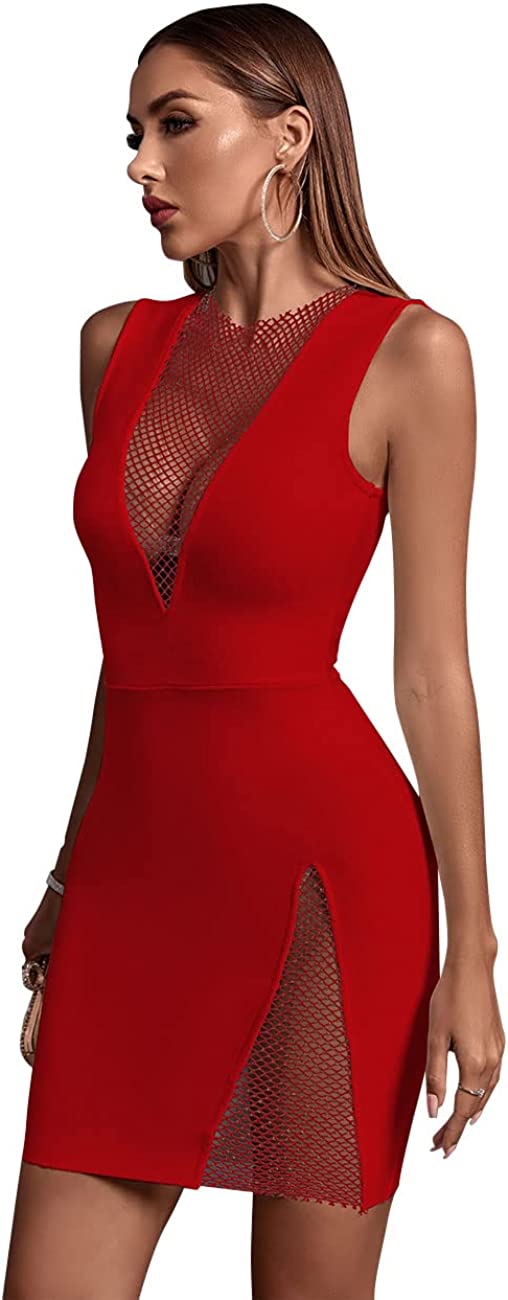 Features:Bandage dress with side split design,ubique waistline detail,plunge v neck,bodycon tight fit,embellished with mesh and rhinestones on the chest and legs,sleeveless and flattering mini length cut