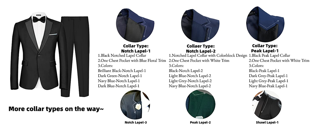 - 【Suitable For Any Occasion】This tuxedo/suit is suitable for many occasions:Dinner/Work/Business/Conference/Wedding/Party/Prom/Halloween/Cruise/Magician/Chorus/Graduation/Date/Fashion show and any other formal occasions,also the best gift for husbands,fathers,brothers and friends.This suit is available in a variety of lapel styles, and we strongly recommend that you purchase different lapel styles and it will be easy to match different occasions.