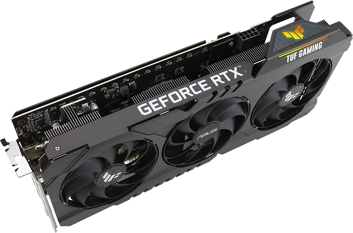 TUF Gaming GeForce RTX™ 3060 Ti V2 OC Edition 8GB GDDR6 with LHR offers a buffed-up design that delivers chart-topping thermal performance. A new all-metal shroud houses three powerful axial-tech fans that utilize durable dual ball fan bearings. Fan rotation has been optimized for reduced turbulence.