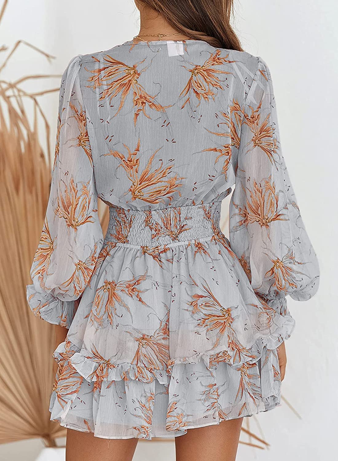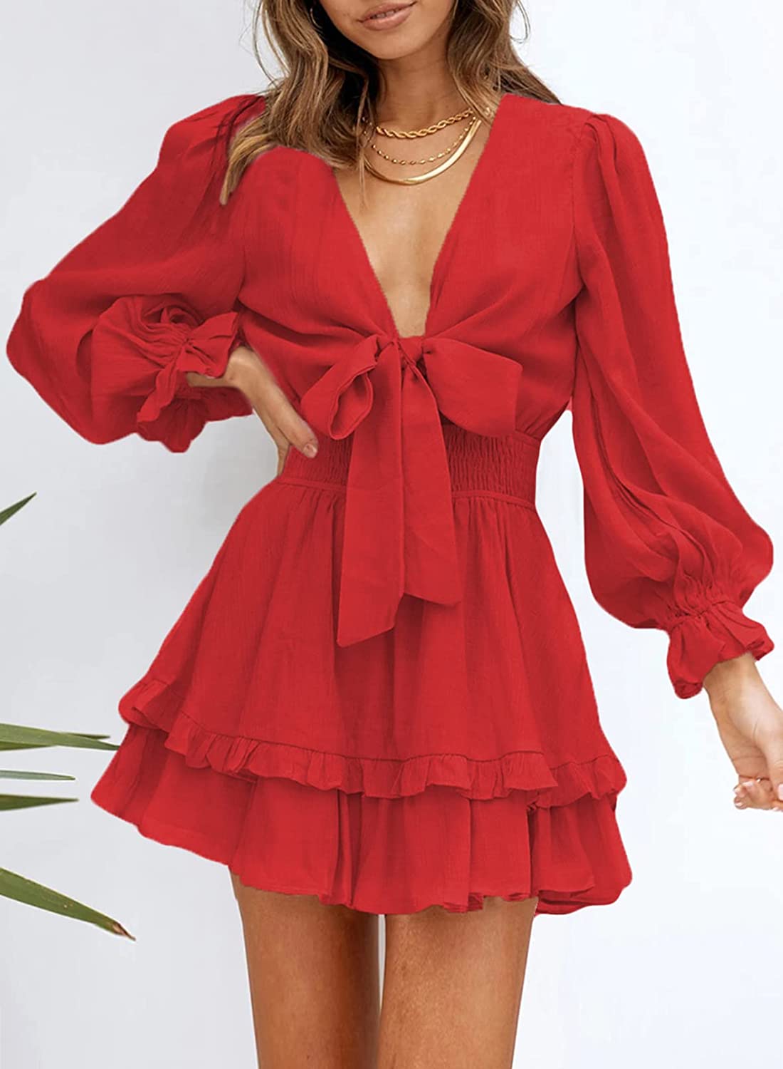 Features: Vintage Solid/ Floral Print Dress,Sexy Deep V-neck,Cut Out Tie Knot Front,Long Puff Sleeve,High Wiast,A Line Silhouette, Short Knee Length,Casual,Bohemian,Flowy Beach Dress.