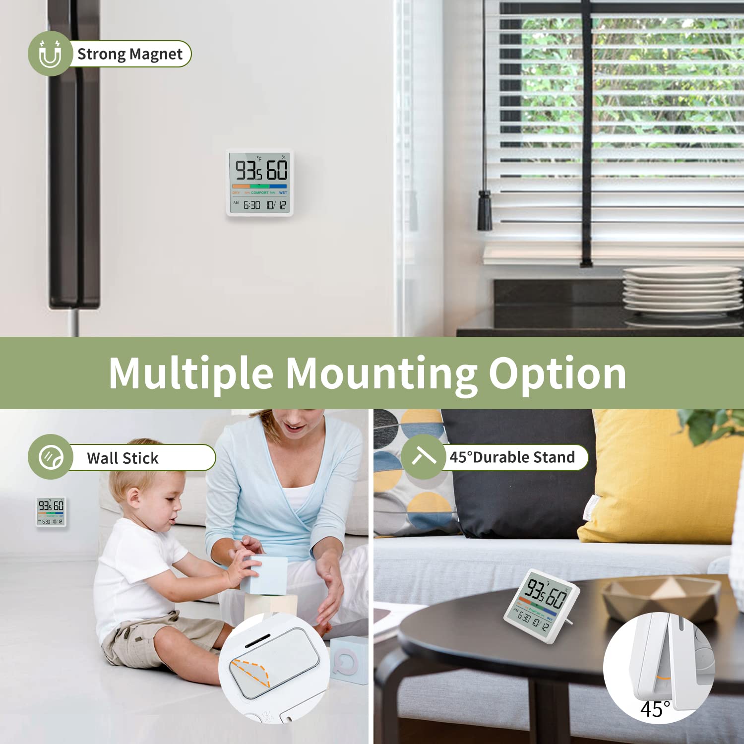 【Minimalist Design with 3 Mounting Options】The inside humidity gauge thermometer can be mounted in a variety of ways: desktop stand, magnet attaching, stick on the wall via the metal adhesive pad. You can stick or place it anywhere you like, such as fridge, counter, living room, greenhouse, baby room, nursery, kitchen, basement, office, conservatory, guitar room, office, garden, cellar, warehouse and more.