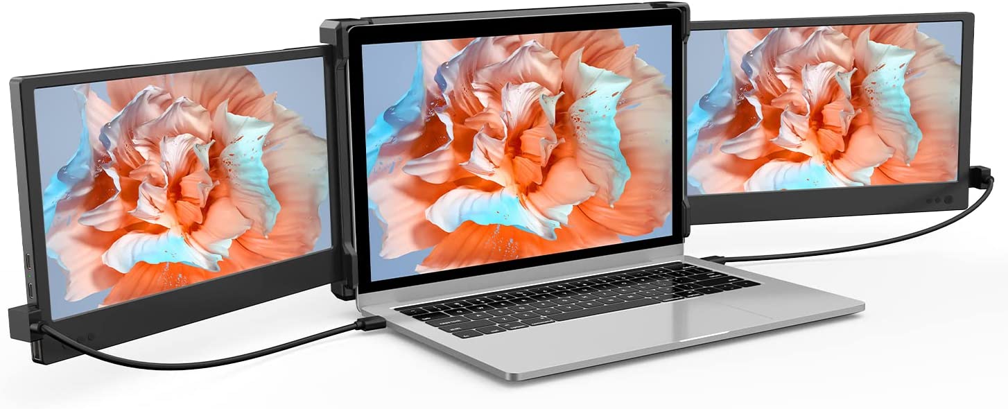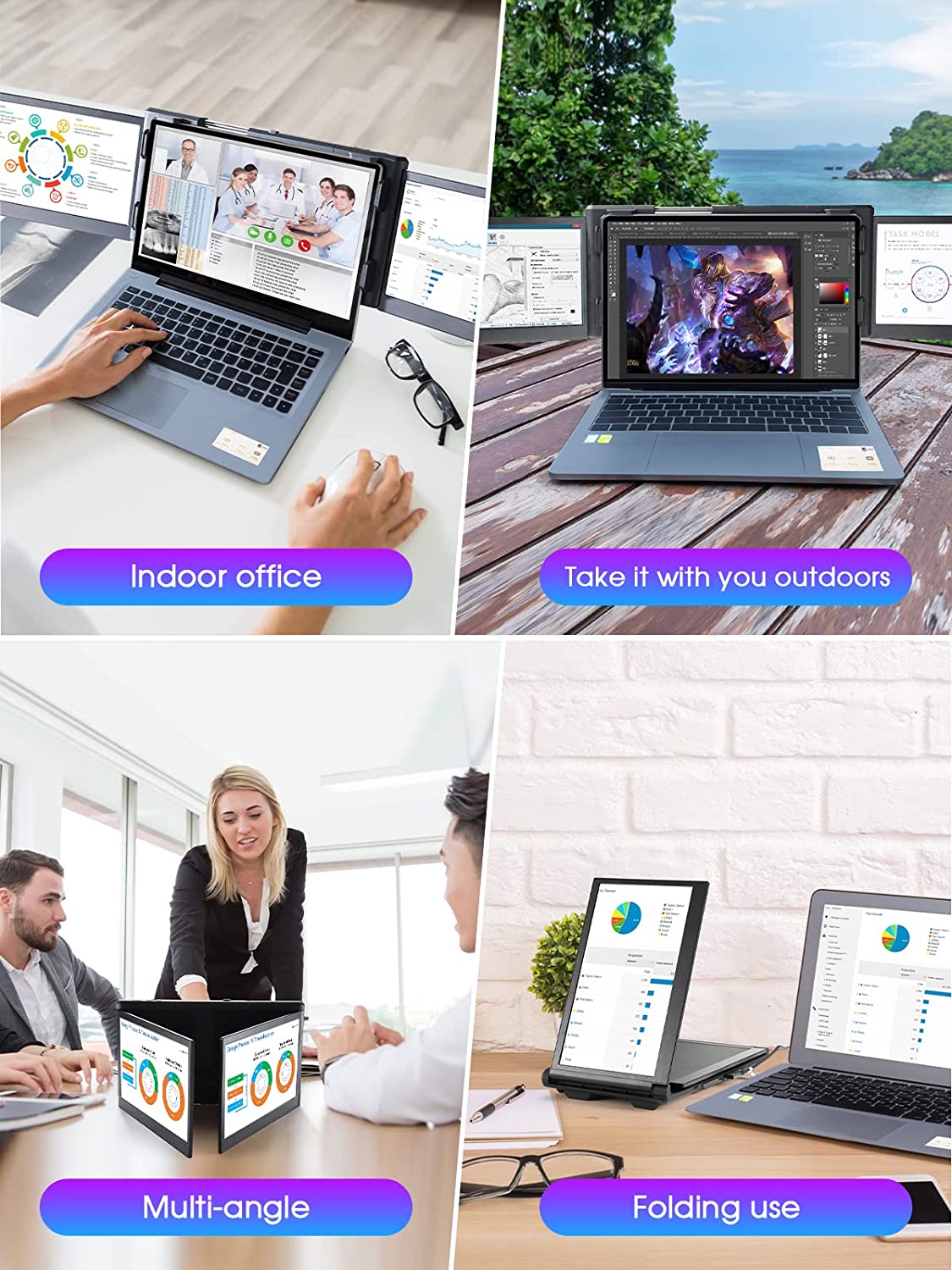 【Easy-to-use design】 The triple portable monitor for laptop can be easily clipped to the laptop frame by just press the button to adjust the size, No need any attachment such as magnets and snaps. Design with a stable and retractable bracket,can be effectively hold the extender to a suitable angle,at the same time prevent the weight of the extender hurt your laptop own screen.