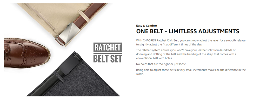 • FOR EXACT FIT - Rachette belt allows for up to 1/5" adjustments for perfect fit everywhere. The click belt features an easily removable buckle that allows you to cut the dress belt to your ideal size.