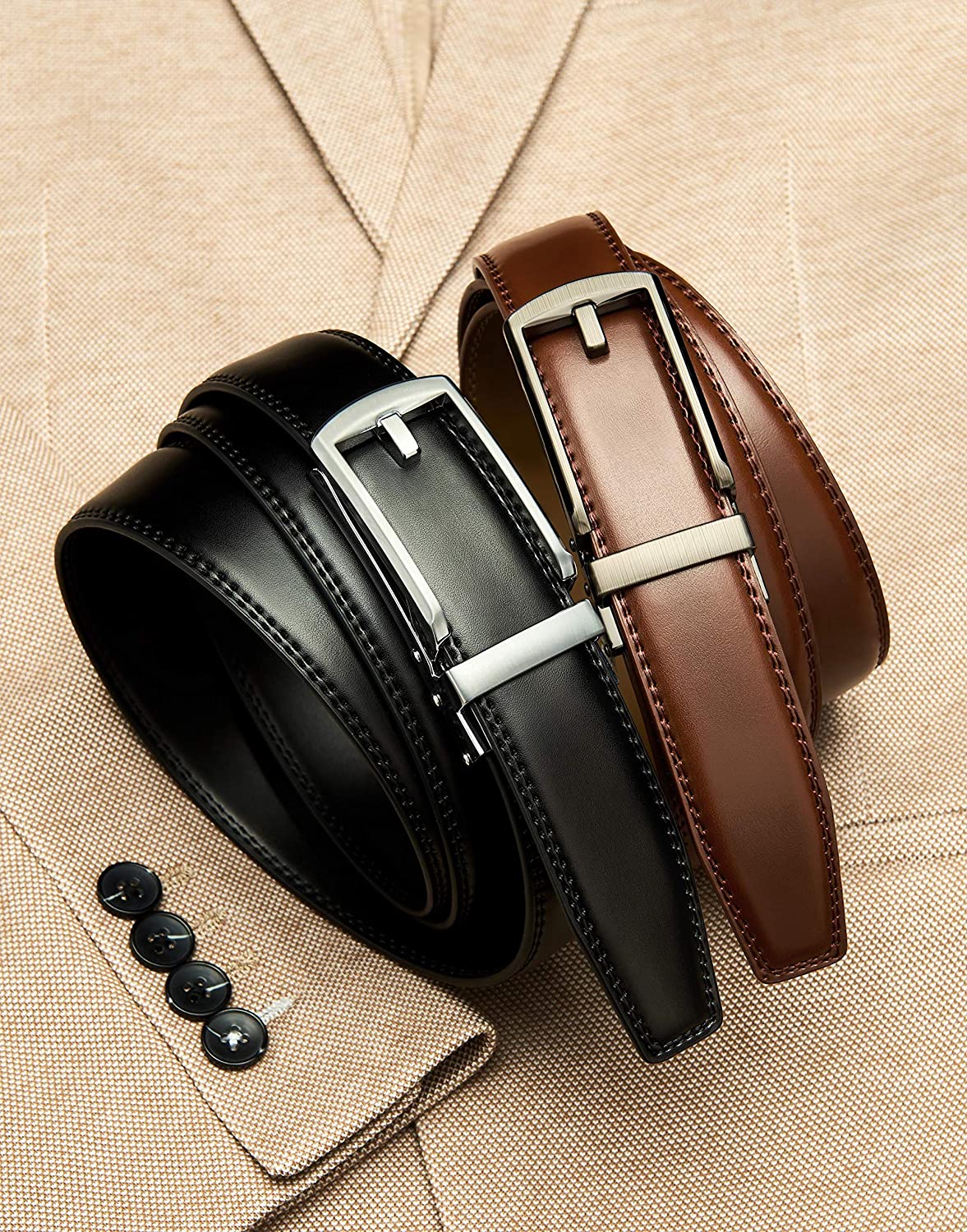 - EASY TO USE - Slide the mens dress belt into the sliding buckle, and the holeless belt auto-locks. Lift the automatic buckle, and pull the rachette belt to release. Simple, smooth, and sleek!