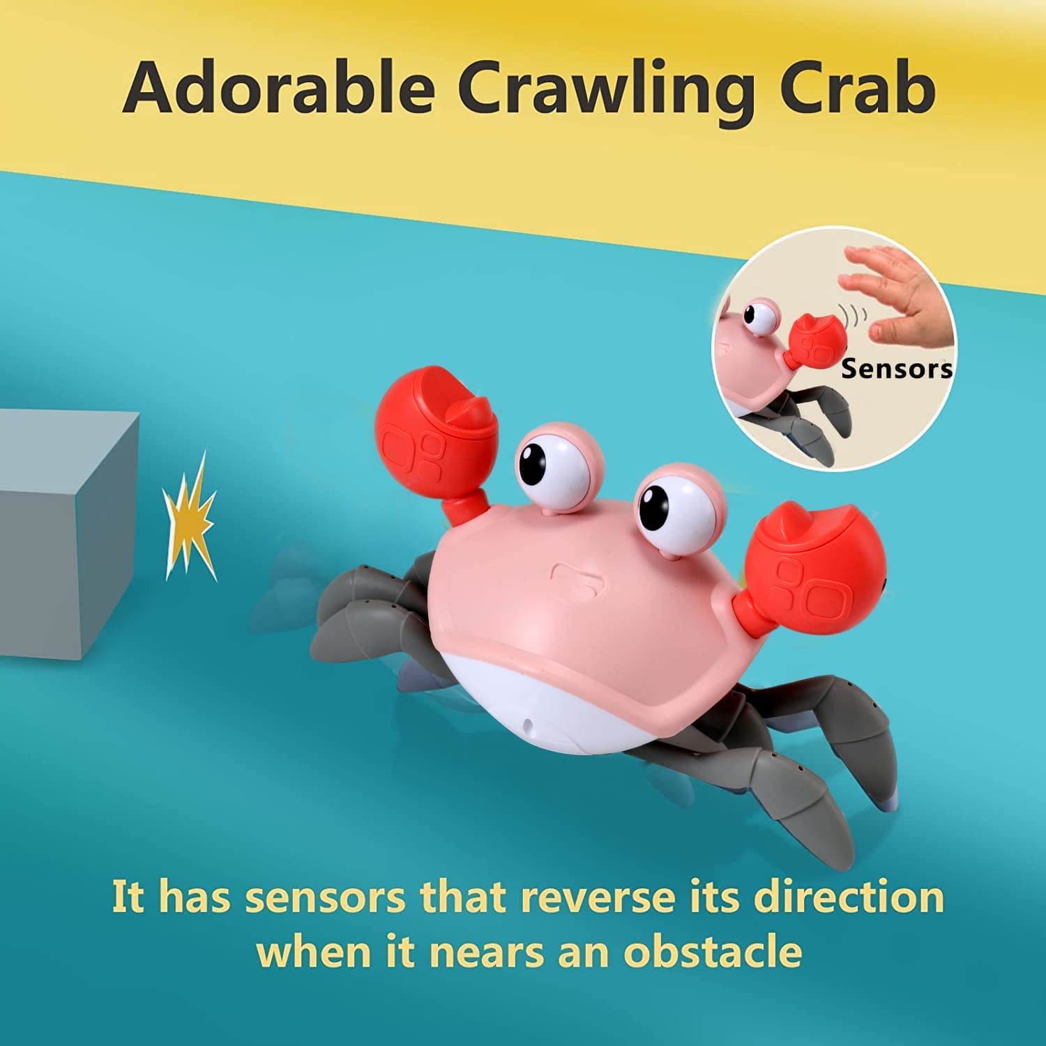 ? Crawling Crab Baby Toy: It moving fast, skitters sideways like a real crab, and plays fun sounds and music and lights up. It has sensors that reverse its direction when it nears an obstacle.