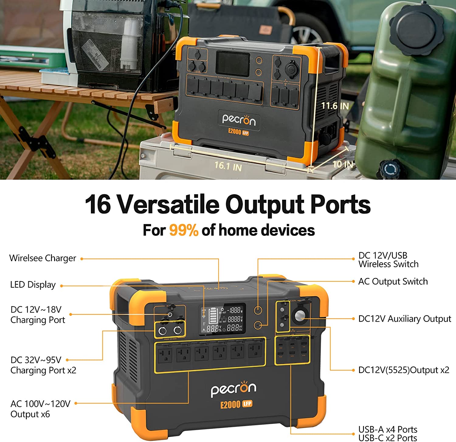 • Power it ALL:E2000LFP has 16 output ports that can run up to 16 devices at a time. Including 6x 2000W AC outlets, 6x USB ports up to PD 100W, 1x Cigar port, 2x DC ports, and 1x 15W wireless charger,compatible with virtually all essential devices