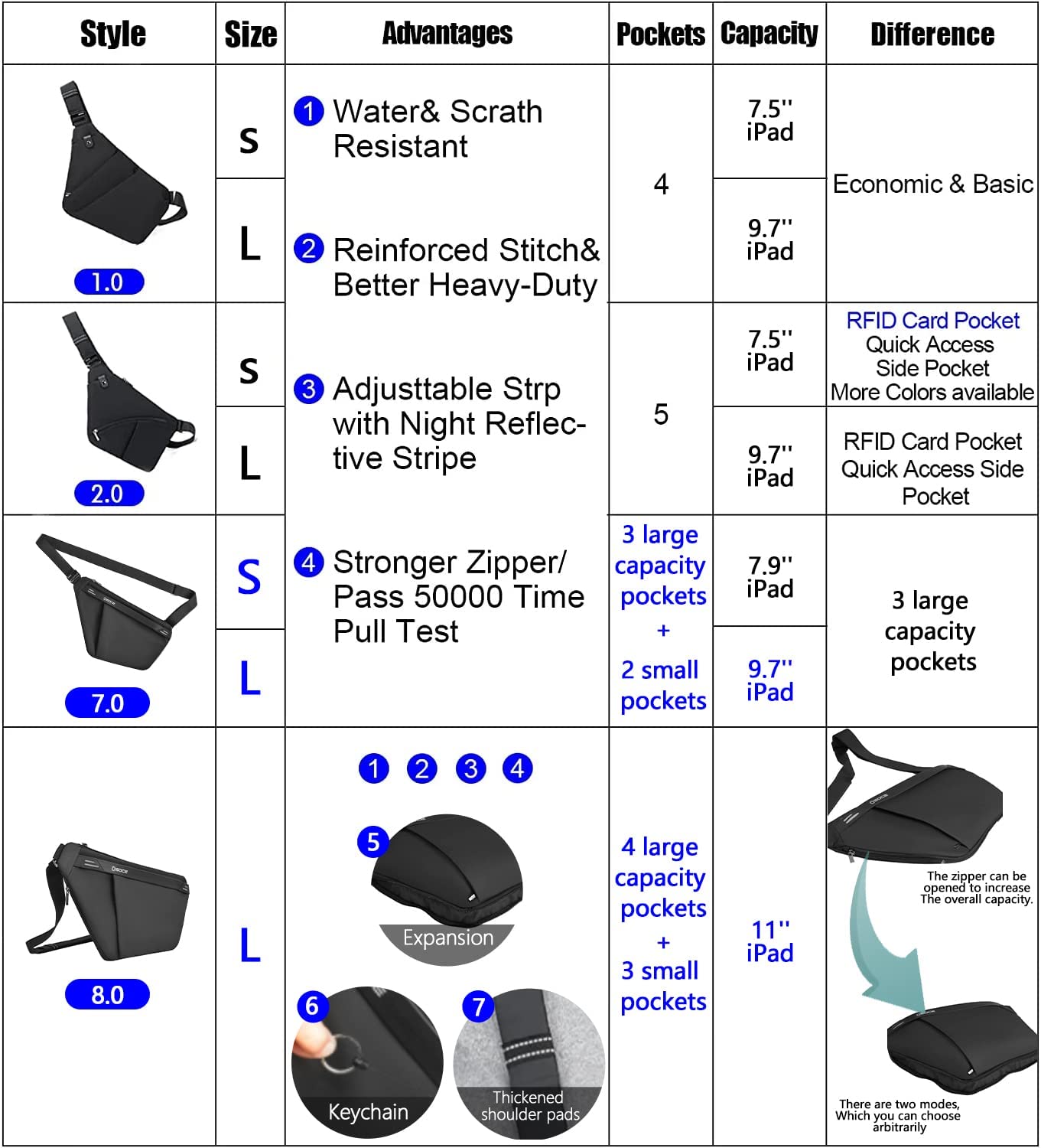 - [Anti-theft sling bag]: With the unique hidding pockets design, this sling backpack includes 5 pockets to meet defferent needs. The anti-theft function will best protect your personal belongings.