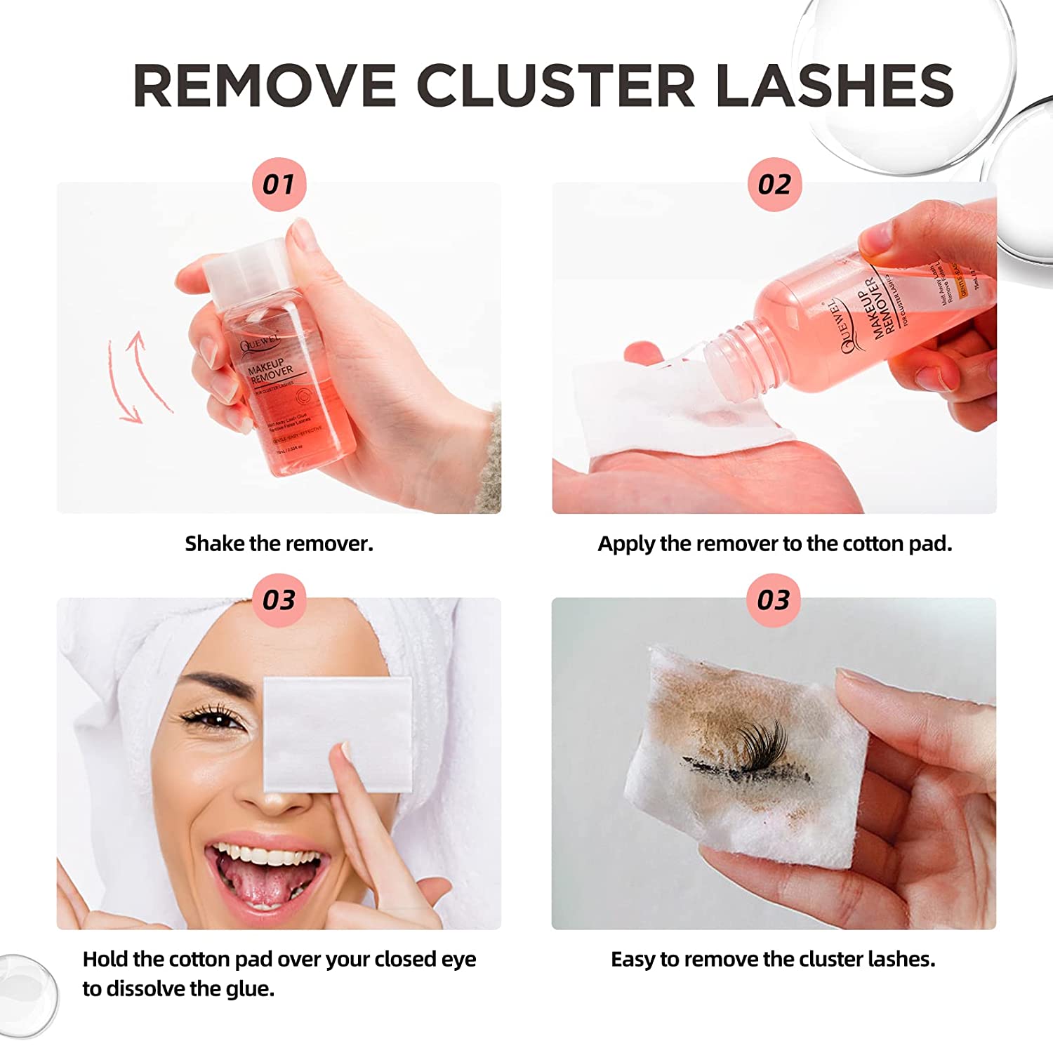 【Easy to Apply】Two ways to remove cluster lashes. Method 1: Dip cluster eyelashes remover on cotton pads, place the pad over the eyes for a while, then wipe off gently and remove the lash clusters. Method 2: Dip the cluster lashes remover on the brush; Gently brush off the cluster lashes and then rinse your eyes. Besides, you can also clean up the residues of the used cluster lashes with disposable brushes for reuse.