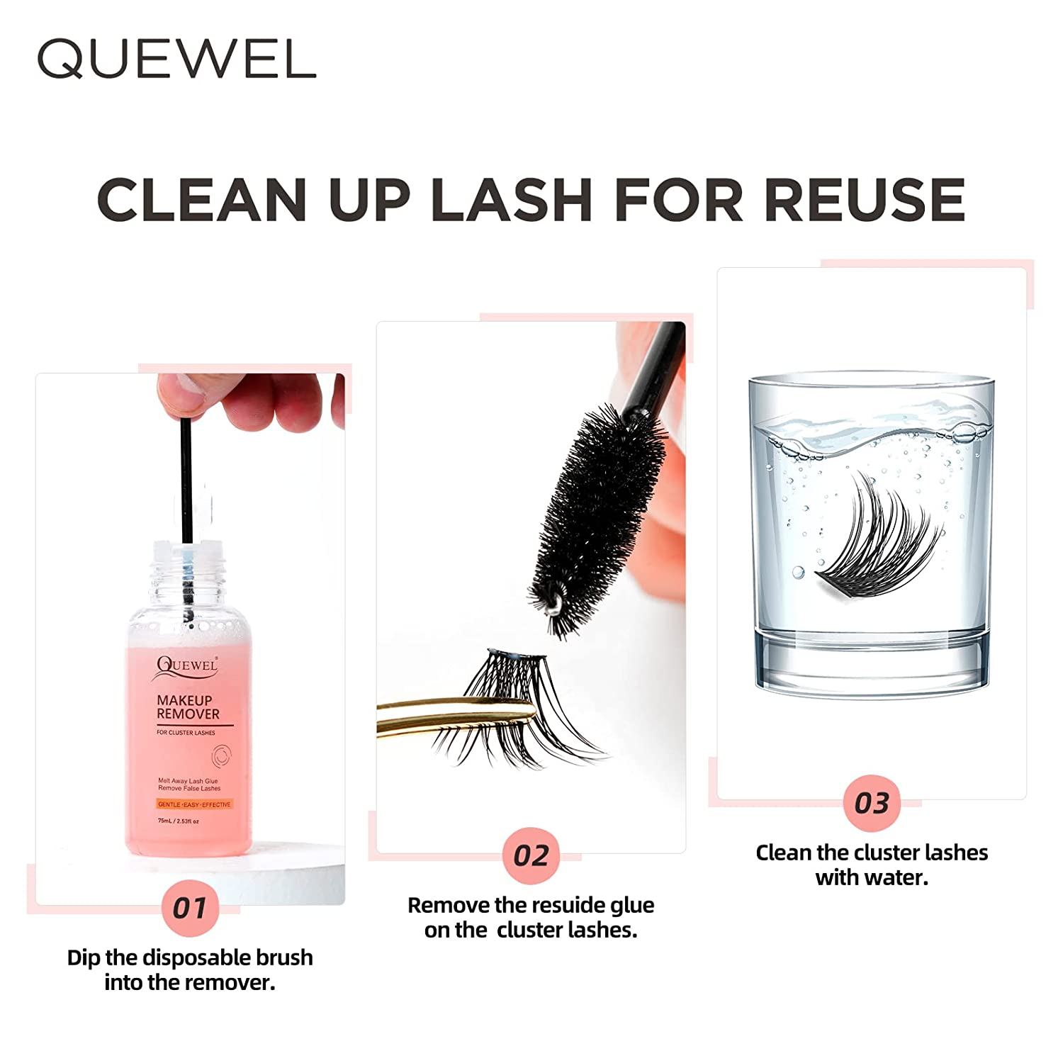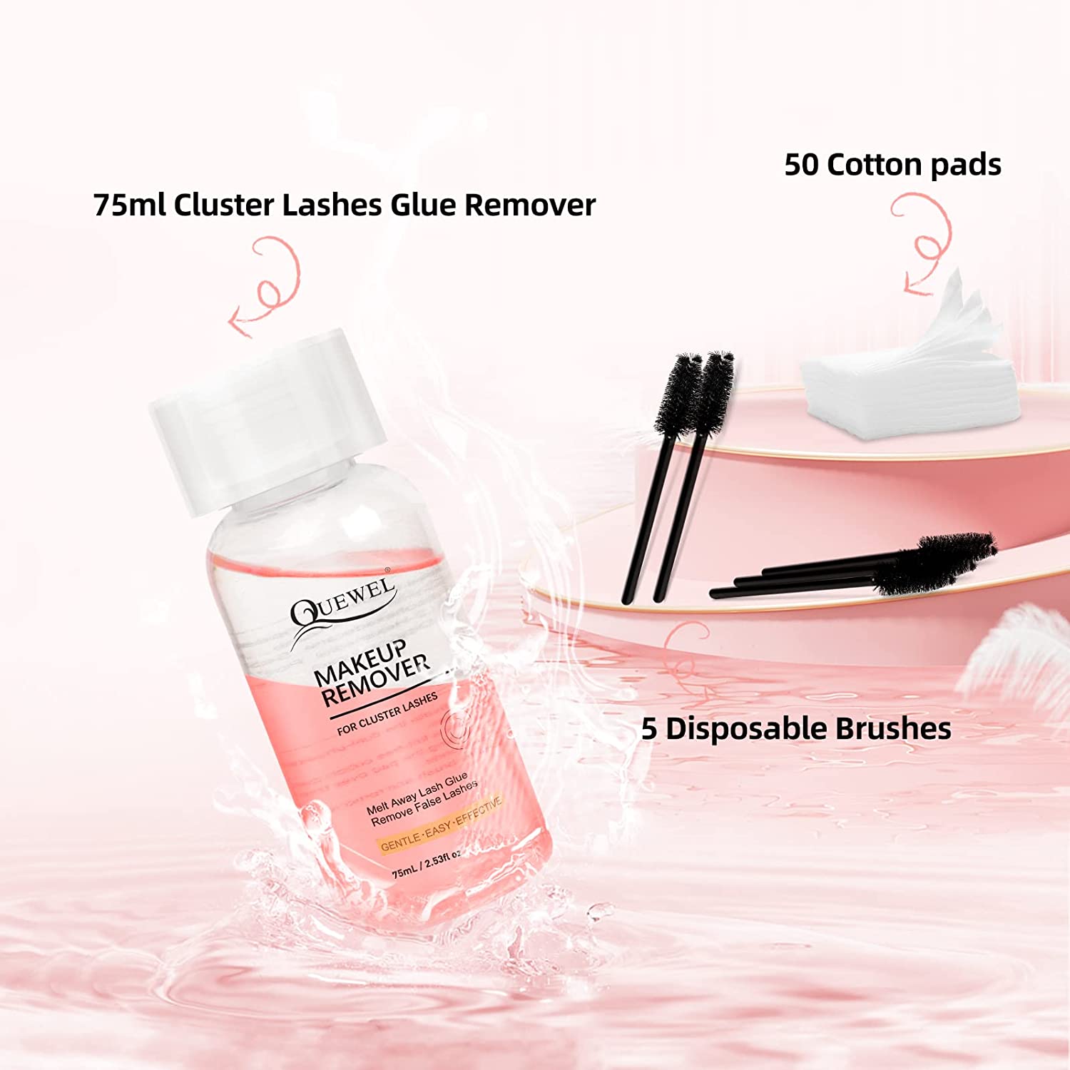【Specification】QUEWEL lash clusters glue remover kit, 75ml cluster lashes glue remover, 50 cotton pads, 5 disposable brushes, the colors of those brushes are random. Affordable price cleaning cluster lashes kits with wide practicability, easily remove lash clusters glue, lash bond and seal, best partner for DIY lashes extension at home.