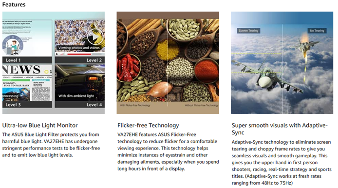 The frameless Asus VA27EHE eye Care monitor features a 27-inch IPS panel and 178° wide viewing angle For a vivid image quality with minimal color shifeet Eliminate tracing and ensure crisp and clear video playback with its featured Adaptive-Sync technology and refresh rate of up to 75Hz.