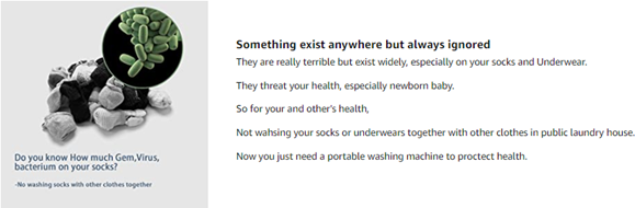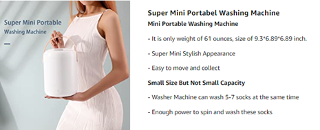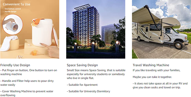 • 【Mini Portable Washing Machine】- Mini Shape do not mean small capacity. This mini portable washing machine features 3.8 lbs. wash capacity. It can wash 1-2 underwears/2-3 baby clothes /3-4 adult socks/5-6 baby socks at the same times. Please Note: This camping washing machine is used for some small and delicate items. Please don’t put some heavy items like sweaters and bed sheet.