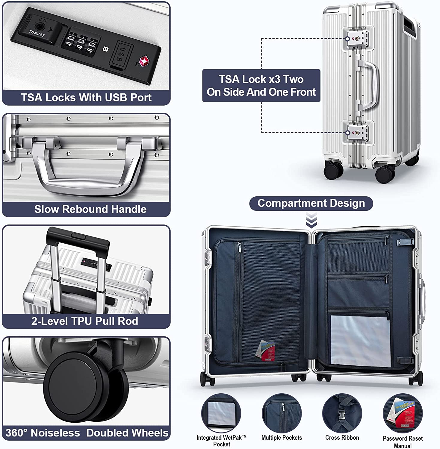 Dimension & Details:22”×14”×9” & 3×TSA Locks & 4×Rubberized Spinner Wheels & Reinforced Metal Corner Guard & Side Bumper Feet & 2-Lever Smooth Telescope Handle & Slow Rebound Handle.