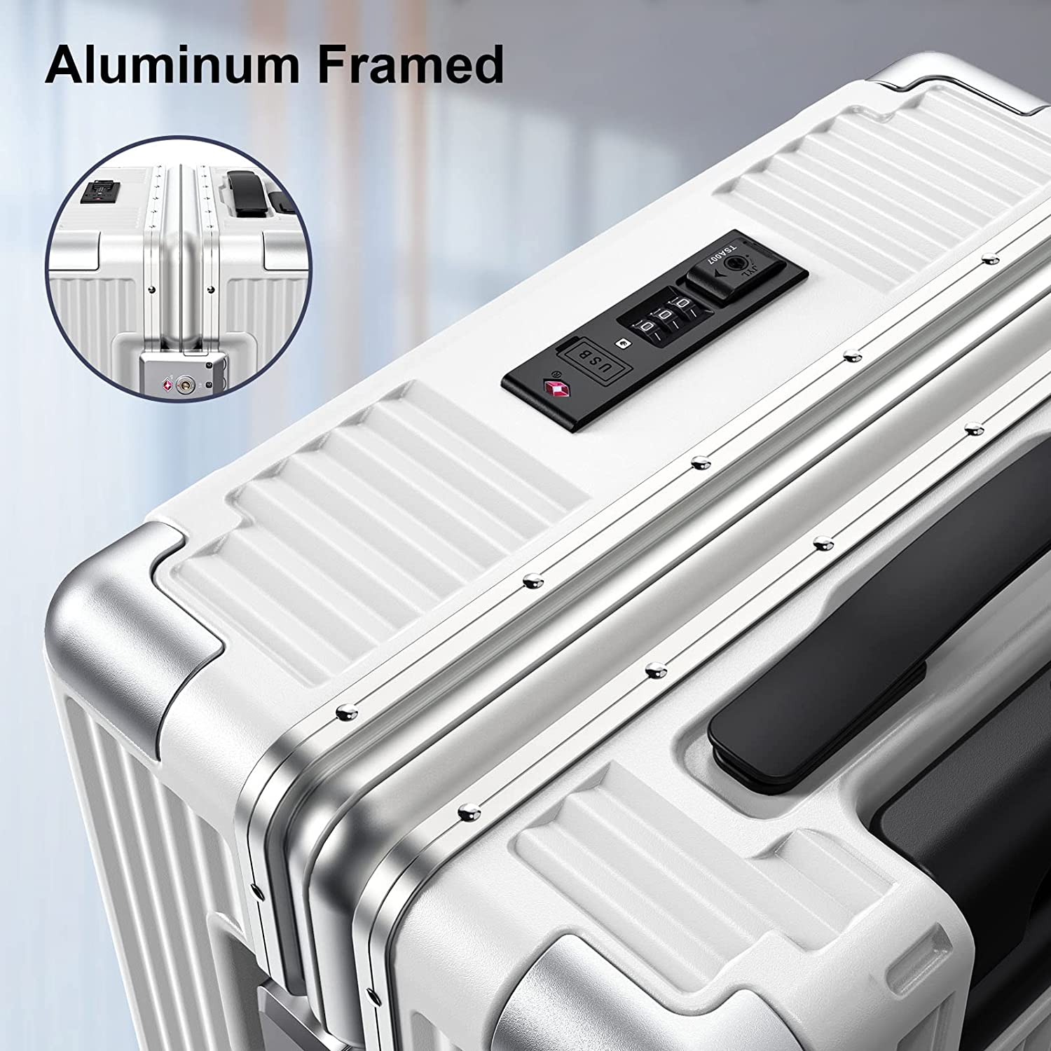SOMODE Airline Approved Carry On Luggage with Spinner Wheels,Aluminum Framed Carry On Suitcase with Front Open Laptop Compartment/Pocket 22×14×9 inch Large Checked-in Luggage(White)