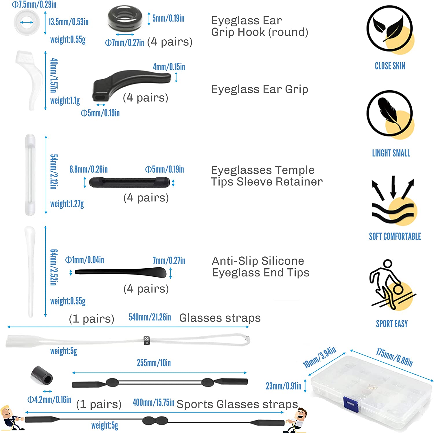?Safety Eyewear Retainers:we have 6 types 10 styles 18 pairs 34pcs (black and white),2 pairs x Sports Glasses straps,4 pairs x Eyeglass Ear Grip Hook,4 pairs x Eyeglass Ear Grip Hook (round),4 pairs x Eyeglasses Temple Tips Sleeve Retainer,4 pairs x Anti-Slip Silicone Eyeglass End Tips
