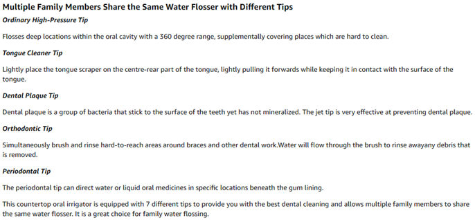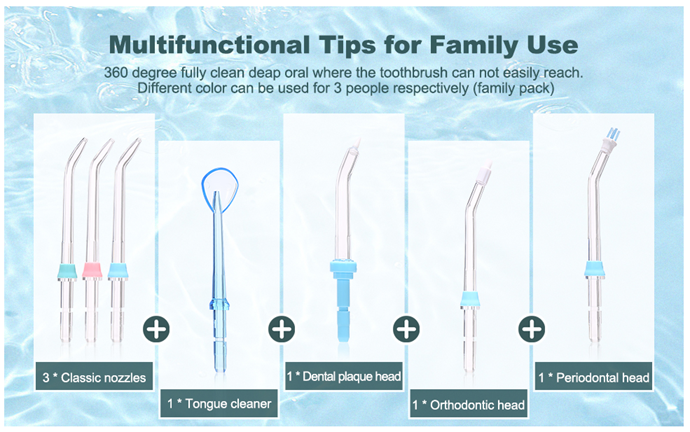 - 【7 Household Multifunctional Nozzles】The household oral irrigator has 7 heads, including 3 classic nozzles, 1 tongue cleaner, 1 dental plaque head, 1 orthodontic head, and 1 periodontal head. These multi-function nozzles can help you clean the hard-to-reach areas of the toothbrush. The nozzle can be stored in the sealing groove cover hygienically and conveniently