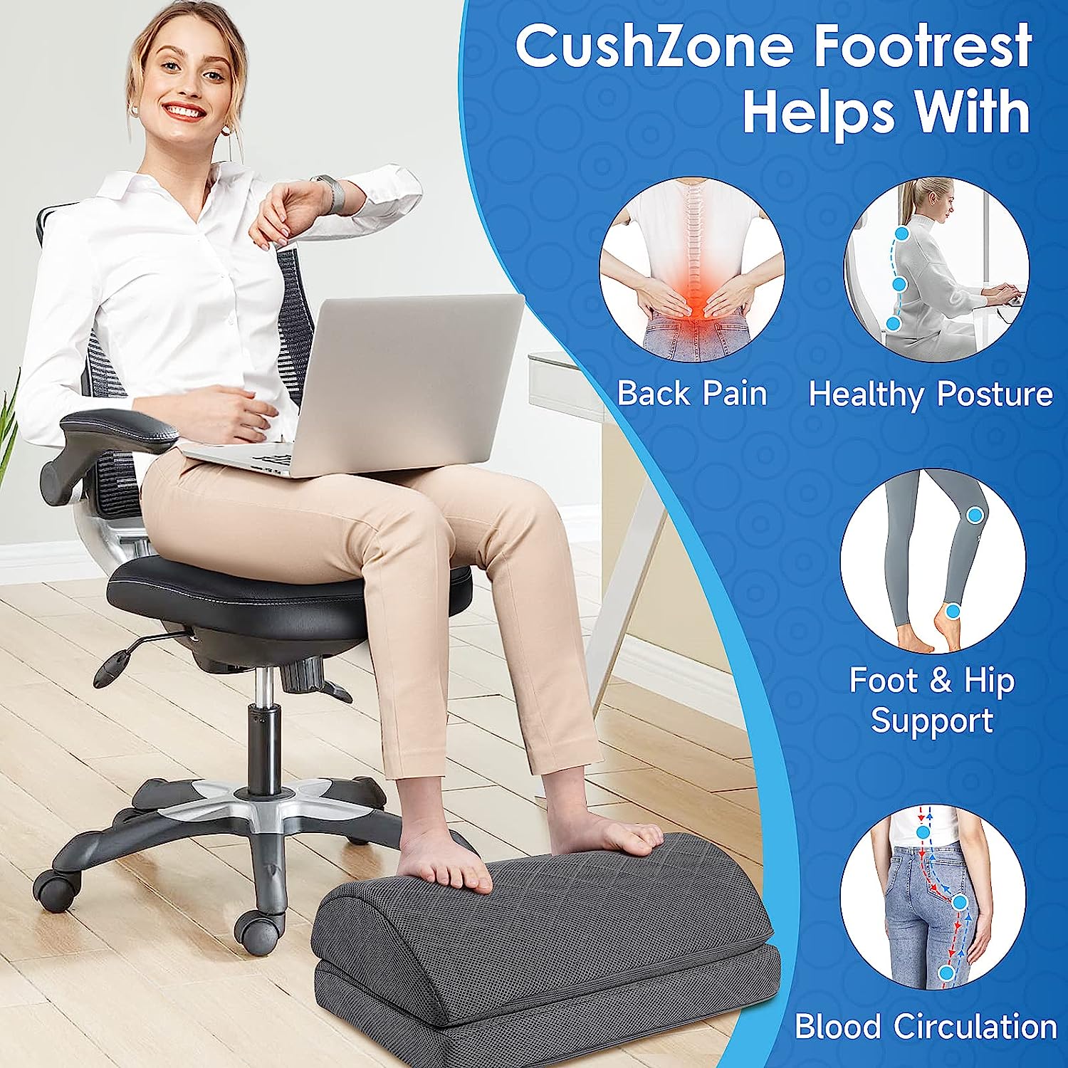 - Provides A Comfortable Sitting Position: Pain relief and support for back, hip, legs, knees & feet, the CushZone footrest will reduce pressure on your lower back and hips by cushioning the bottom of your feet to help alleviate back and sciatica pain. Our footstool will also ensure proper foot placement while sitting and correct sitting posture to help improve blood circulation in the legs and relieve pain over time.