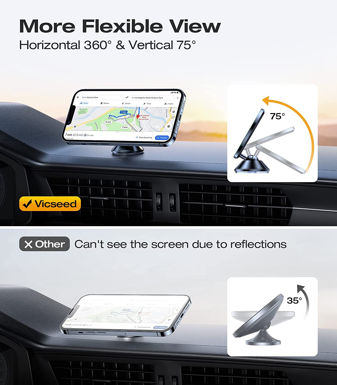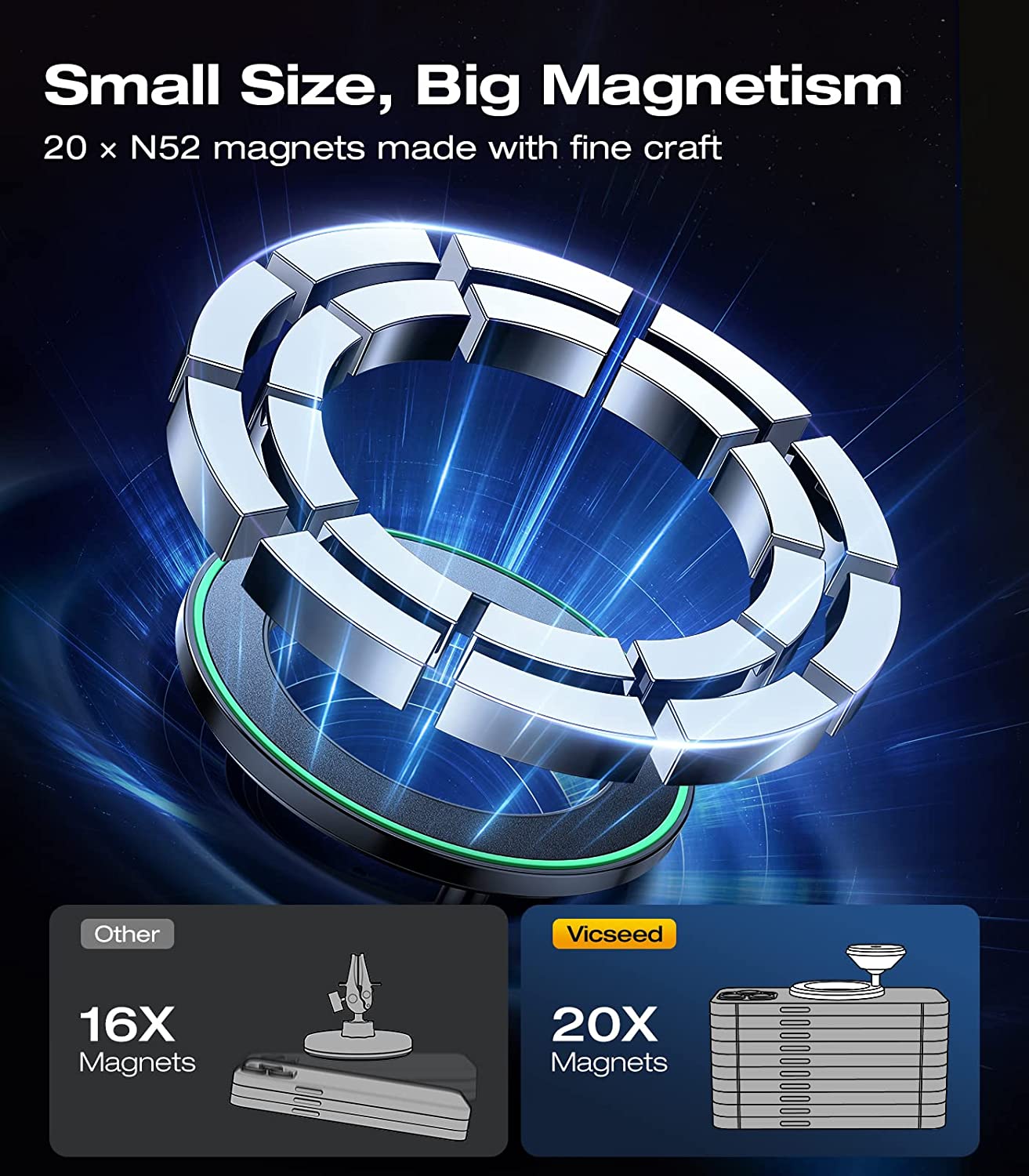 ?Powerful Magnetic & Safe Driving - This magnetic phone holder for car has built-in 20 strong N52 magnets, the magnetic force is much stronger than common 12 magnet holder on the market. Even when your car is taking sharp turns or driving on the bumpiest roads, your phone will never fall from the phone mount and distract you. The car mount is annular closed magnetic field, not interfere with the signal to keep the navigation and calling open. Use Vicseed car holder to keep you safe on the go