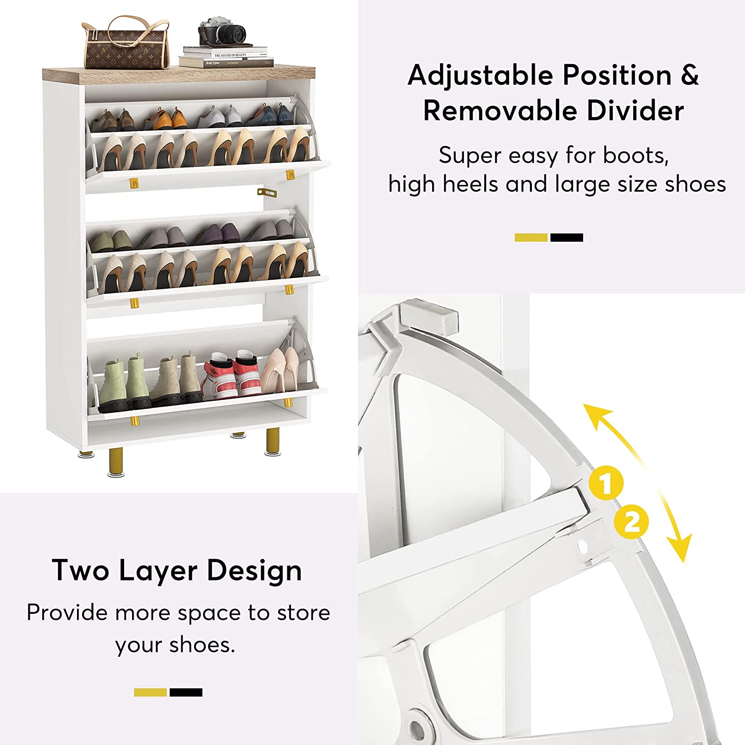 • 【New Power for Shoe Storage】Two rows in each compartment, the 3 fold-out drawer shoe cabinet can store up to 18-24 pairs. (Depend on the height and size of shoes). The tabletop is perfect for decors, while the bottom space can keep adding pairs of shoes.