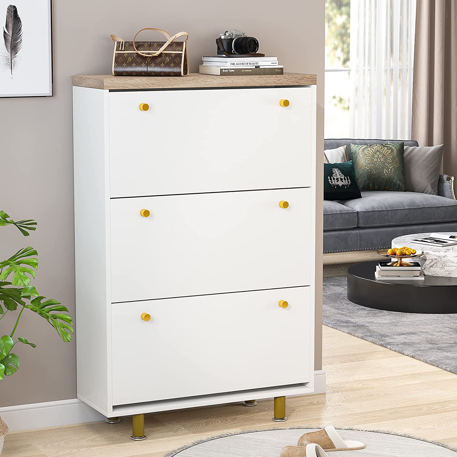 Tribesigns 3 Drawer Shoe Cabinet, Freestanding Shoe Rack Storage Organizer with Flip Door, Modern Tipping Bucket Shoe Cabinet for Entryway, Hallway, Bedroom, Small Spaces, White