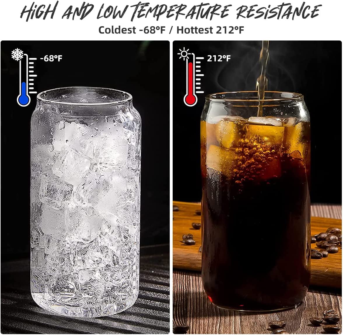 Premium Healthy Quality Glass Cups:The glass tumblers with lid and straw are made of high-quality durable clear glass, Lead-free and BPA-free.The thick glasses can withstand the sudden changes in the temperature difference between -68°F to 212°F.