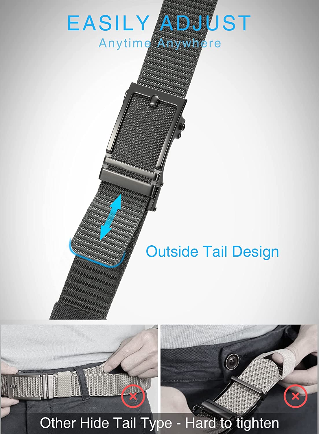 ✦【Easy to Use】Just slide the casual belt into the buckle and pull web belt through, the ratchet buckle simply automatic locks.To release the ratchet belt, gently push the lever on the side of the buckle and pull the webbing out. External sliding design make it easier and quicker.