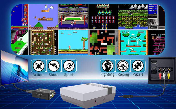 - ? Classic Retro Game Console,Childhood Memories : The classic retro game console was very popular in the 80s of the last world,built-in 620 classic video games which include action,fighting and racing and other types.no need to download and insert cards.These games are fun and challenging,and can bring you back to your childhood memories instantly.