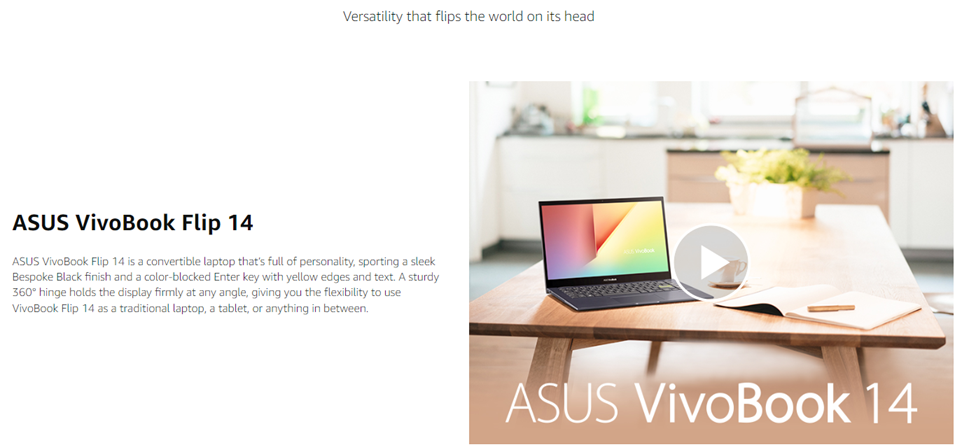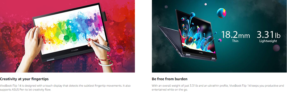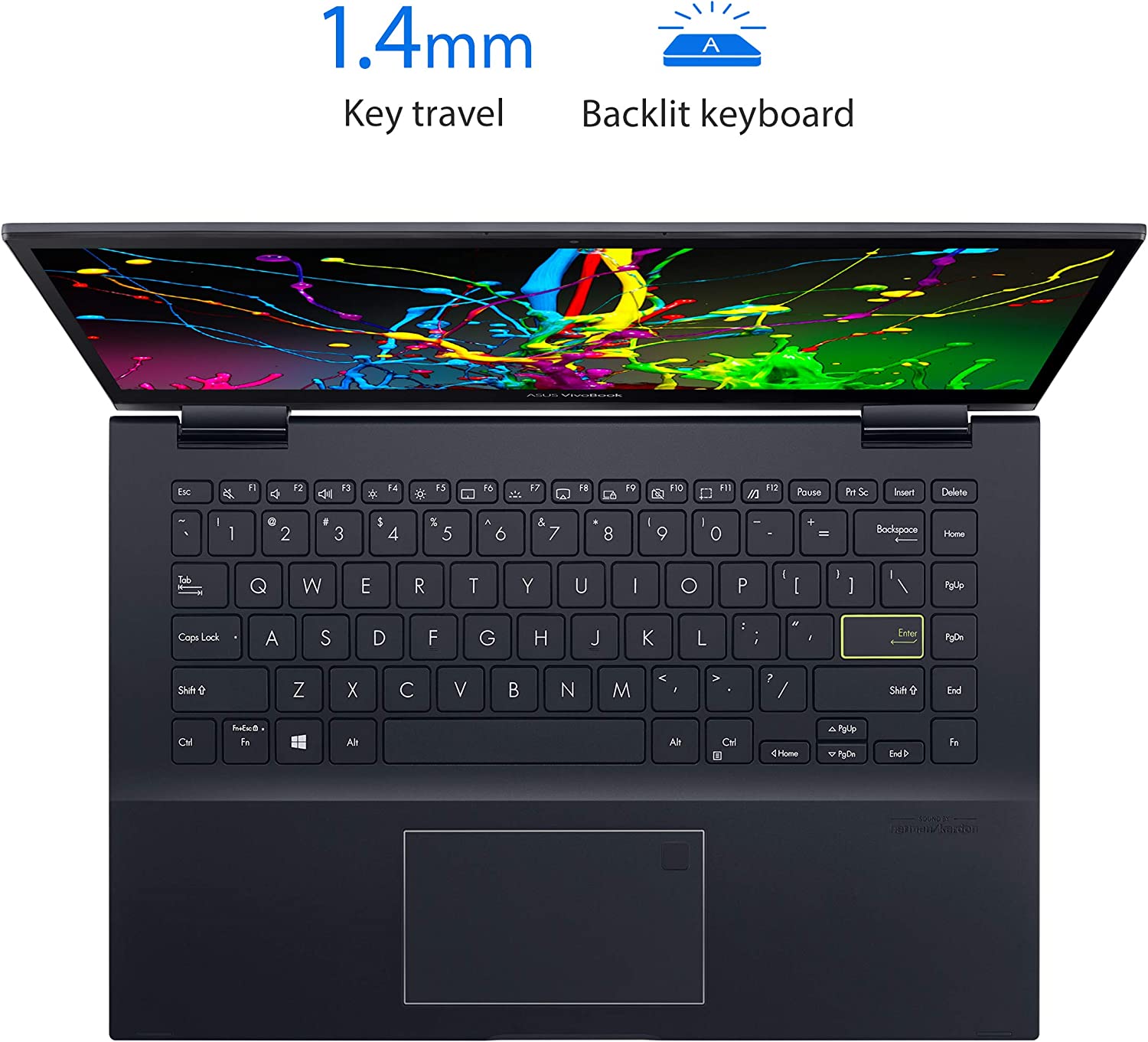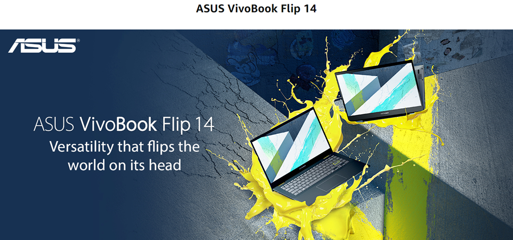 ASUS VivoBook Flip 14 is a convertible laptop that’s full of personality, sporting a sleek Bespoke Black finish and a color-blocked Enter key with yellow edges and text. Ready for performance, VivoBook Flip 14 is powered by up to an AMD Ryzen 7 5700 mobile processor with 8GB memory and features a up to 512GB PCIe SSD. A sturdy 360° hinge holds the display firmly at any angle, giving you the flexibility to use VivoBook Flip 14 as a traditional laptop, a tablet, or anything in between. For Free Windows 11 upgrade eligible devices, visit ASUS Windows 11 website for more information.