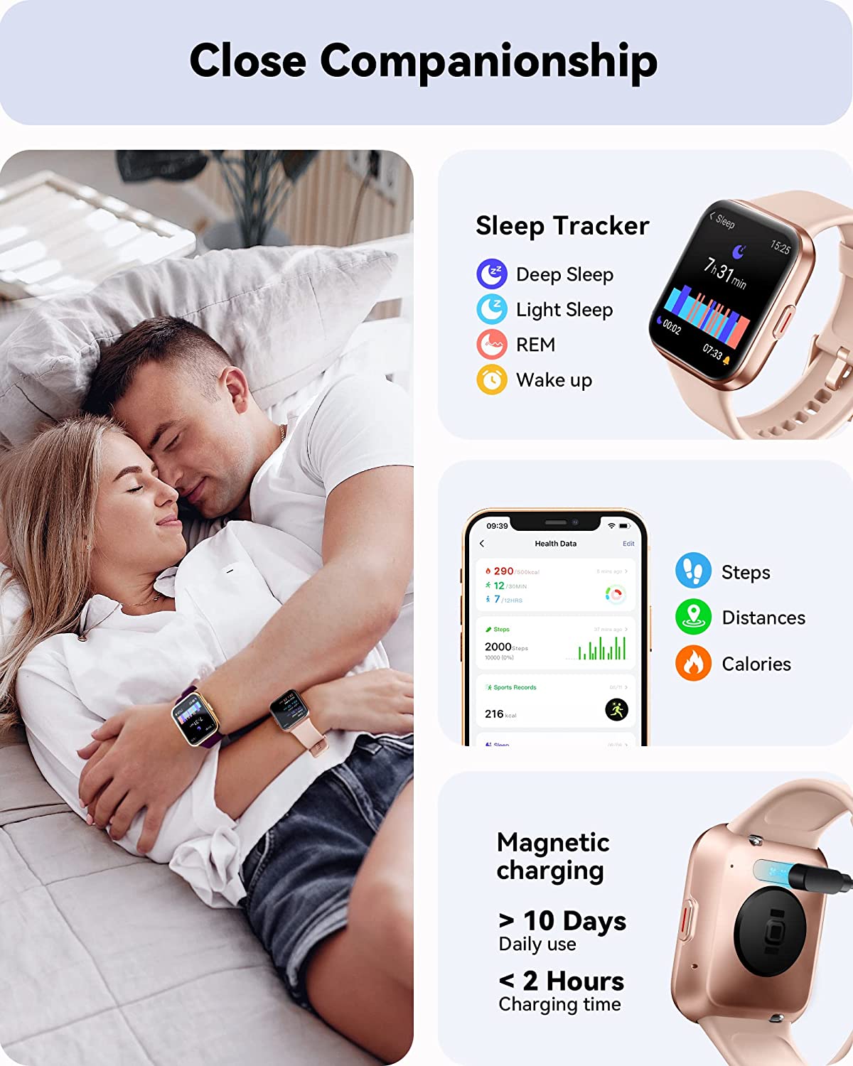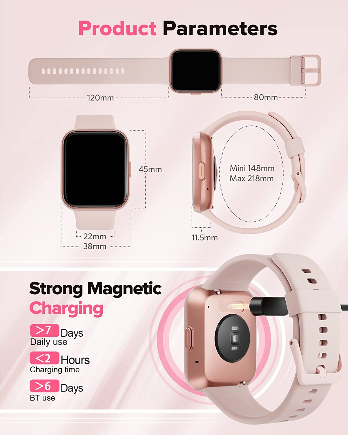 • 【Convenient Life Assistant】Smart watch for women has many useful features such as Women's Health, Pedometer, Weather Forecast, Noise Detection, Alarm Clock, Stopwatch, Music Control, Brightness Adjustment, etc, which can play an important role in daily life. Smart watches for women can be used for more than 7 days (within 2 hours) on one charge and on standby for over 25 days