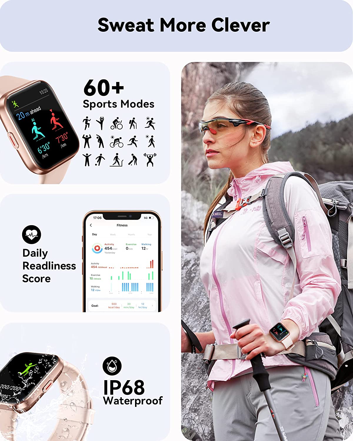 • 【60 Sports Modes and IP68 Water Resistance】With 60 built-in Sport modes and IP68 water resistance, fitness Tracker for women meets most sports enthusiasts` needs. Fitness tracker for women provides fitness data, including calories, steps, distance, and workout time, generate fitness report after a workout