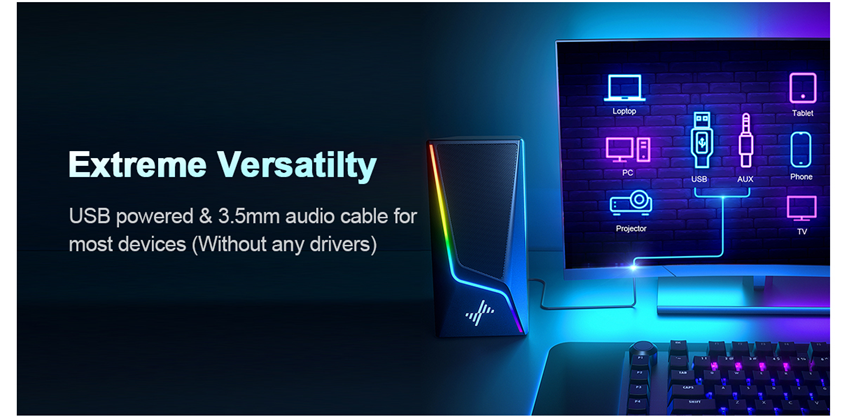 - 【Plug and Play】Equipped with a USB cable and 3.5mm audio cable, the gaming speaker is plug-and-play for a wide range of PC, laptop, phone, or tablet compatibility (No drivers needed).