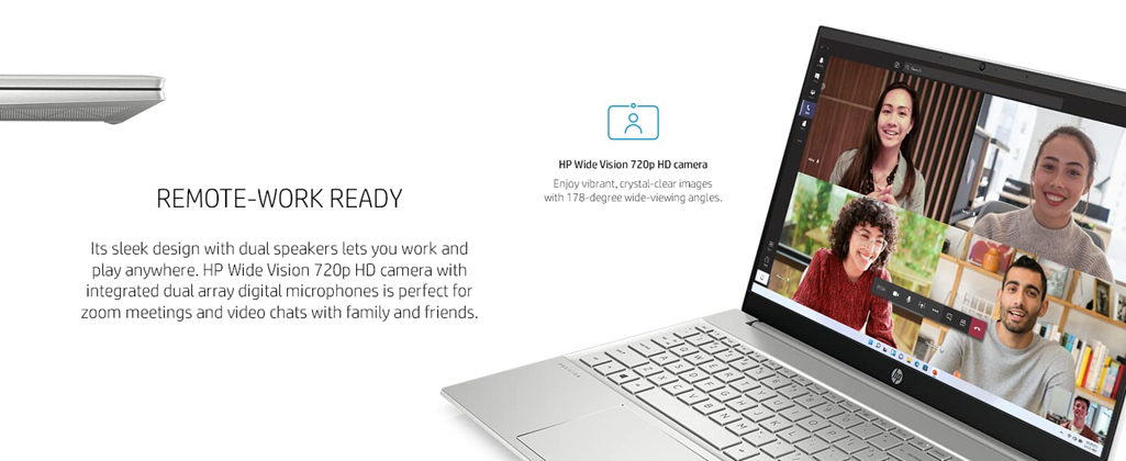 The HP Pavilion 15 Laptop has all the performance for mind-blowing entertainment you enjoy, but in a smaller, lightweight PC. The Full HD, IPS, micro-edge display combines with audio by BandO to give you robust, authentic theater-level entertainment (1). Intel Iris Xe Graphics (2) delivers the impressive performance needed for your creating, gaming, and entertainment while the 11th Generation Intel Core i7-1165G7 processor (3) gives you the instant responsiveness and best-in-class connectivity modern users crave. The HP Pavilion laptop’s 512 GB PCIe NVMe M.2 SSD storage outclasses traditional hard drives with 15 times the performance (4). Experience improved multitasking thanks to 16 GB of RAM. Work all day with up to 8 hours of battery life (5) and go from 0 to 50% charge in approximately 45 minutes with HP Fast Charge (6). Windows 10 Pro blends seamlessly and powerfully with this HP 15 Laptop for an optimized computing experience (7). Get more done with solid connection speeds from the powerful Wi-Fi 6 (2x2) (9) and Bluetooth 5.0 combo (10) and work comfortably with the familiar feel of a full-sized keyboard. Your HP laptop checks all the boxes with a 1-year limited hardware warranty, ENERGY STAR certification (12), EPEAT Silver registered (13), and a low halogen display (14). (1) Full High Definition (FHD) content is required to view FHD images. (2) Shared video memory (UMA) uses part of the total system memory for video performance. System memory dedicated to video performance is not available for other use by other programs. (3) Multi-core is designed to improve the performance of certain software products. Not all customers or software applications will necessarily benefit from the use of this technology. Performance and clock frequency will vary depending on the application workload and your hardware and software configurations. Intel’s numbering, branding, and/or naming is not a measurement of higher performance. Intel, Pentium, Intel Core, Celeron, Iris Xe, Intel logo, and the Intel Inside logo are trademarks of Intel Corporation in the U.S. and other countries. (4) Based on HP internal testing using CrystalDiskMark benchmarking software. Performance is sequentially faster (read-only) compared to traditional 5,400 rpm HDD. (5) Windows 10 MobileMark 18 battery life will vary depending on various factors including product model, configuration, loaded applications, features, use, wireless functionality, and power management settings. The maximum capacity of the battery will naturally decrease with time and usage. See bapco.com/products/mobilemark-2018/ for additional details. (6) Recharges your battery up to 50% within 45 minutes when the system is off (using “shut down” command). Recommended for use with the HP adapter provided with the notebook, not recommended with a smaller capacity battery charger. After charging has reached 50% capacity, charging speed will return to normal speed. Charging time may vary plus/-10% due to System tolerance. (7) Not all features are available in all editions or versions of Windows. Systems may require upgraded and/or separately purchased hardware, drivers, software, or BIOS update to take full advantage of Windows functionality. Windows 10 is automatically updated, which is always enabled. ISP fees may apply and additional requirements may apply over time for updates. See microsoft.com (8) Upgrade rollout plan is being finalized and is scheduled to begin late in 2021 and continue into 2022. Specific timing will vary by device. Certain features require specific hardware, see http://www.Microsoft.com/windows/windows-11-specifications (9) Wireless access point and internet service required and sold separately. Availability of public wireless access points limited. Wi-Fi 6 (802.11ax) is backwards compatible with prior 802.11 specs. The specifications for Wi-Fi 6 are draft and are not final. If the final specifications differ from the draft specifications, it may affect the ability of the notebook to communicate with other Wi-Fi 6 devices. Only available in countries where 802.11ax is supported. (10) Bluetooth is a trademark owned by its proprietor and used by Hewlett-Packard Company under license. (11) Based on Wi-Fi 5 80MHz and Wi-Fi 6 160MHz minimum requirements when transferring files between two devices connected to the same router. Requires a wireless router, sold separately, that supports 802.11ax (Wi-Fi 6). Only available in countries where 802.11ax is supported. (12) ENERGY STAR and the ENERGY STAR mark are registered trademarks owned by the U.S. Environmental Protection Agency. (13) Based on U.S. EPEAT registration according to IEEE 1680.1-2018 EPEAT. EPEAT status varies by country. (14) External power supplies, power cords, cables, and peripherals are not Low Halogen. Service parts obtained after purchase may not be Low Halogen.